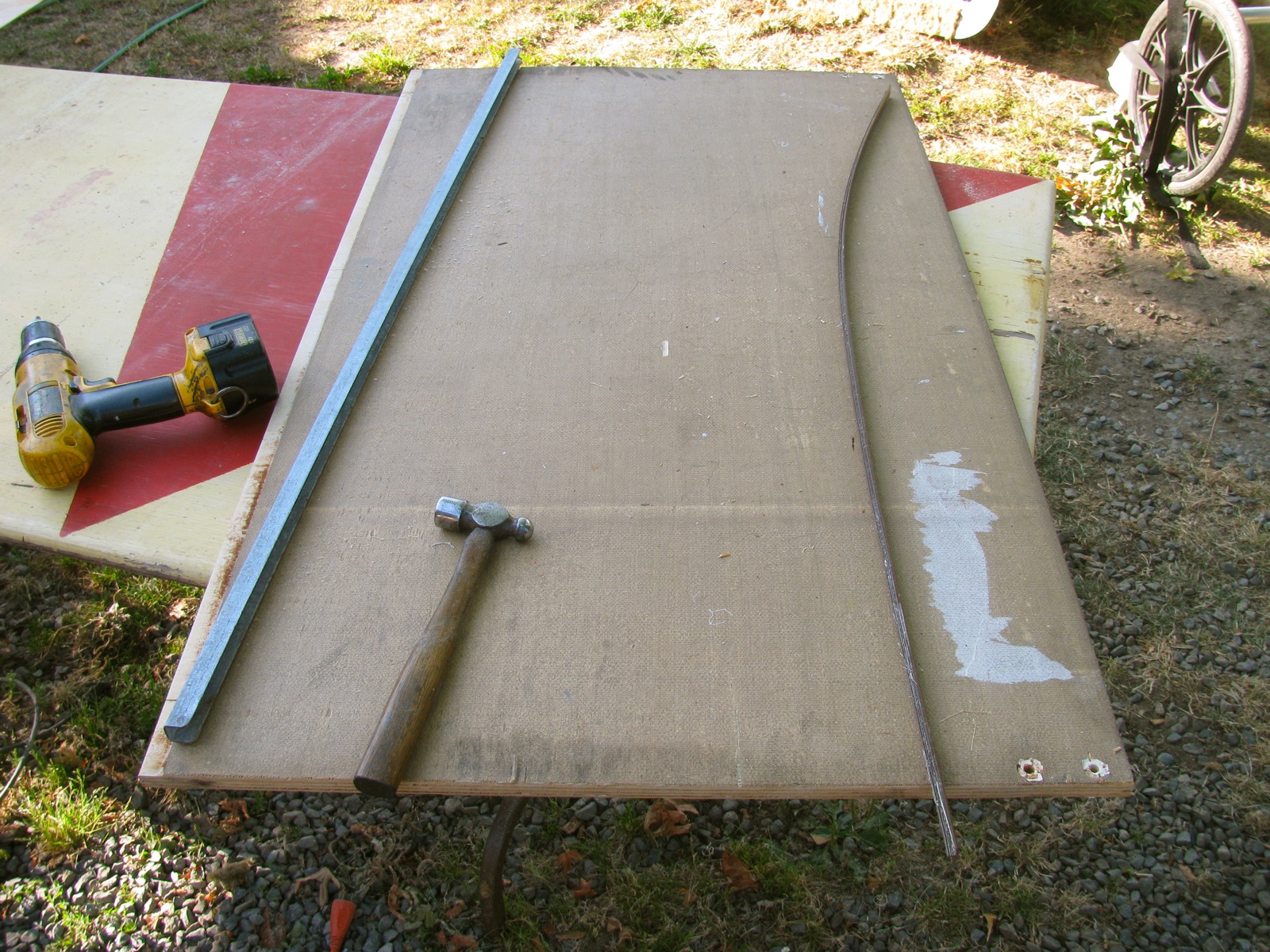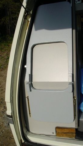 Both sides were finished. But I only some of the fold out section done. This section will be cut in half and additional hinges installed so it can be folded back over the rear section and clear the pop top. There is decreased headroom with the bed platform on top of the roof compared to the stock westy roof where the upper bunk rear section doubles as a ceiling. But more on that later when I get to it. The fold out section has a galvanized steel U-section edge on one end (held on by screws which also hold on snaps for the bunk pad), and a T-section vinyl moulding on the other end.