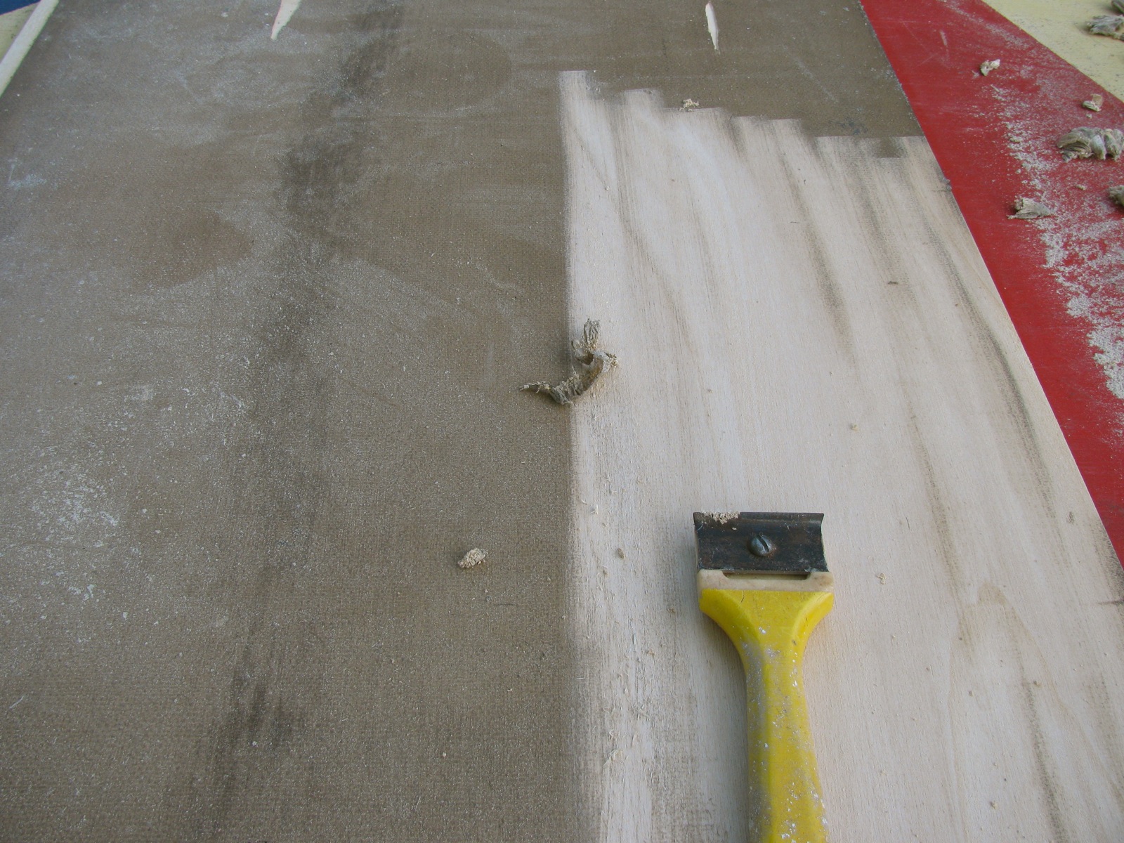 I installed and bolted down the wardrobe and upper cabinet to see how they interacted with the plywood liner. It all looks good and I took a break from that chore and set about cleaning up the upper bunk bed platforms. The plywood looked really manky, the paper had come off years ago and the glue residue had become stained and ugly. It was a real chore to remove the glue, I curse the engineer that specified glue that did not stick to the paper/vinyl coating but did did stick tenaciously to the plywood. I tried a few methods but the best was a sharp paint scraper followed by a random orbit sander (40 grit paper) then hand sanding with finer grit paper.