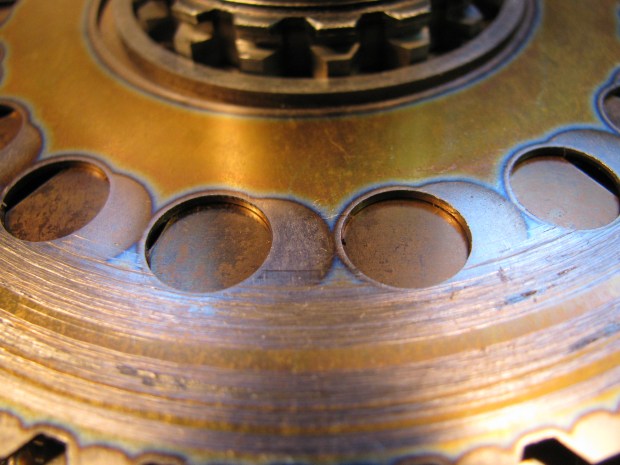 Now remember, these two top plates are not spaced apart. The next plate however, is spaced from the slotted plate you see by approx. 0.025″. Mis-focused on this pic, but included it to keep the arrangement clear. See the wear on it even though it is spaced from the plate above?