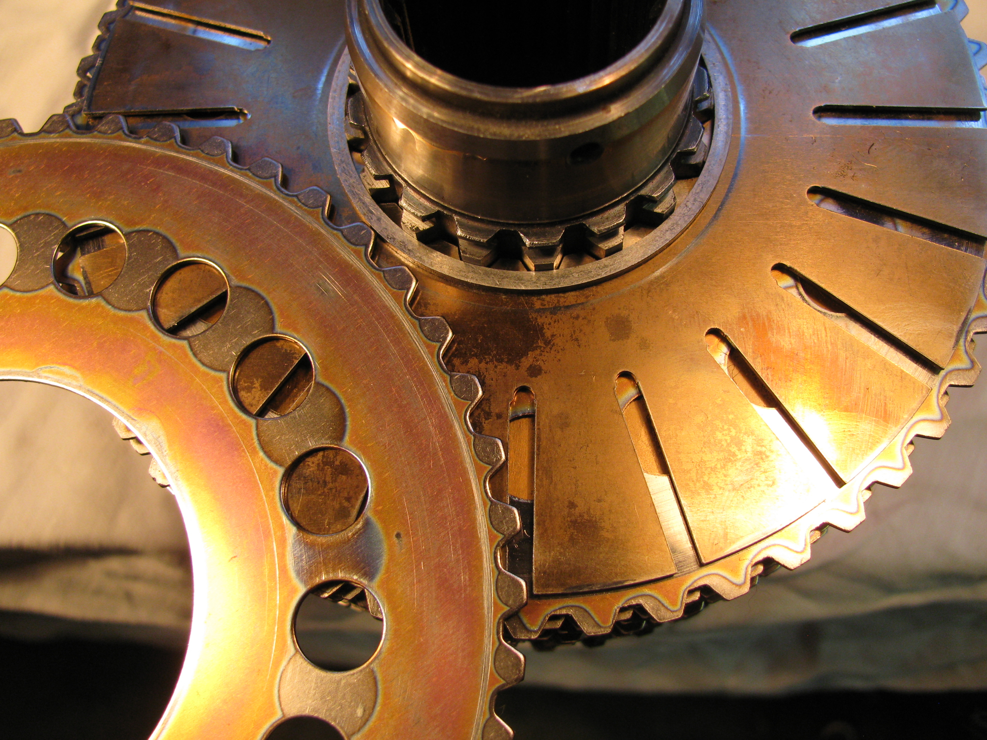 I took some pics (btw, all the pics can be clicked on to get larger image) of the plates in an attempt to see those “burrs” on the holes or slots that are implicated in the hump or STA (self torque amplification) event. I think having my sketch diagram of how the plates and spacers are arranged would be useful here: