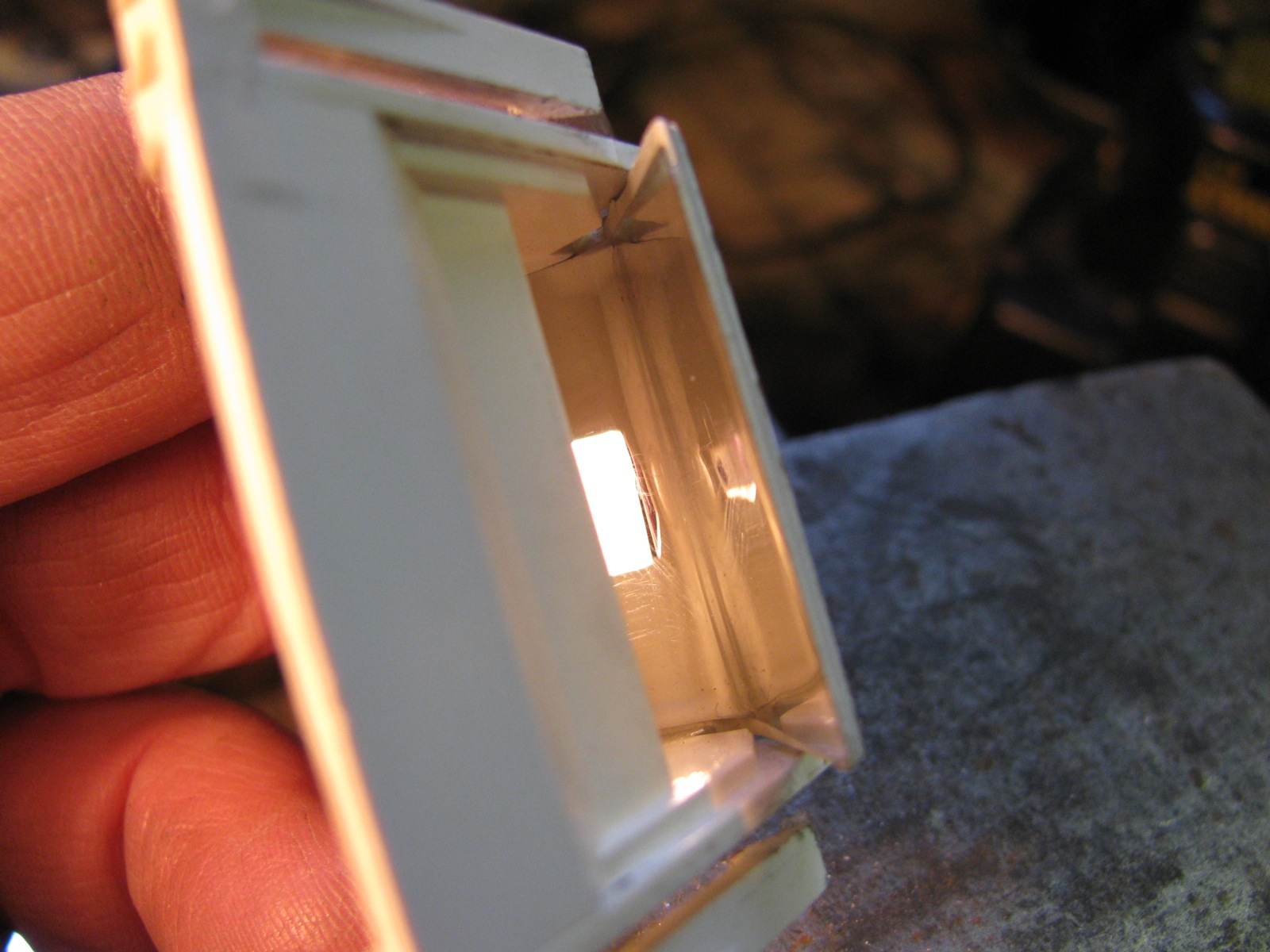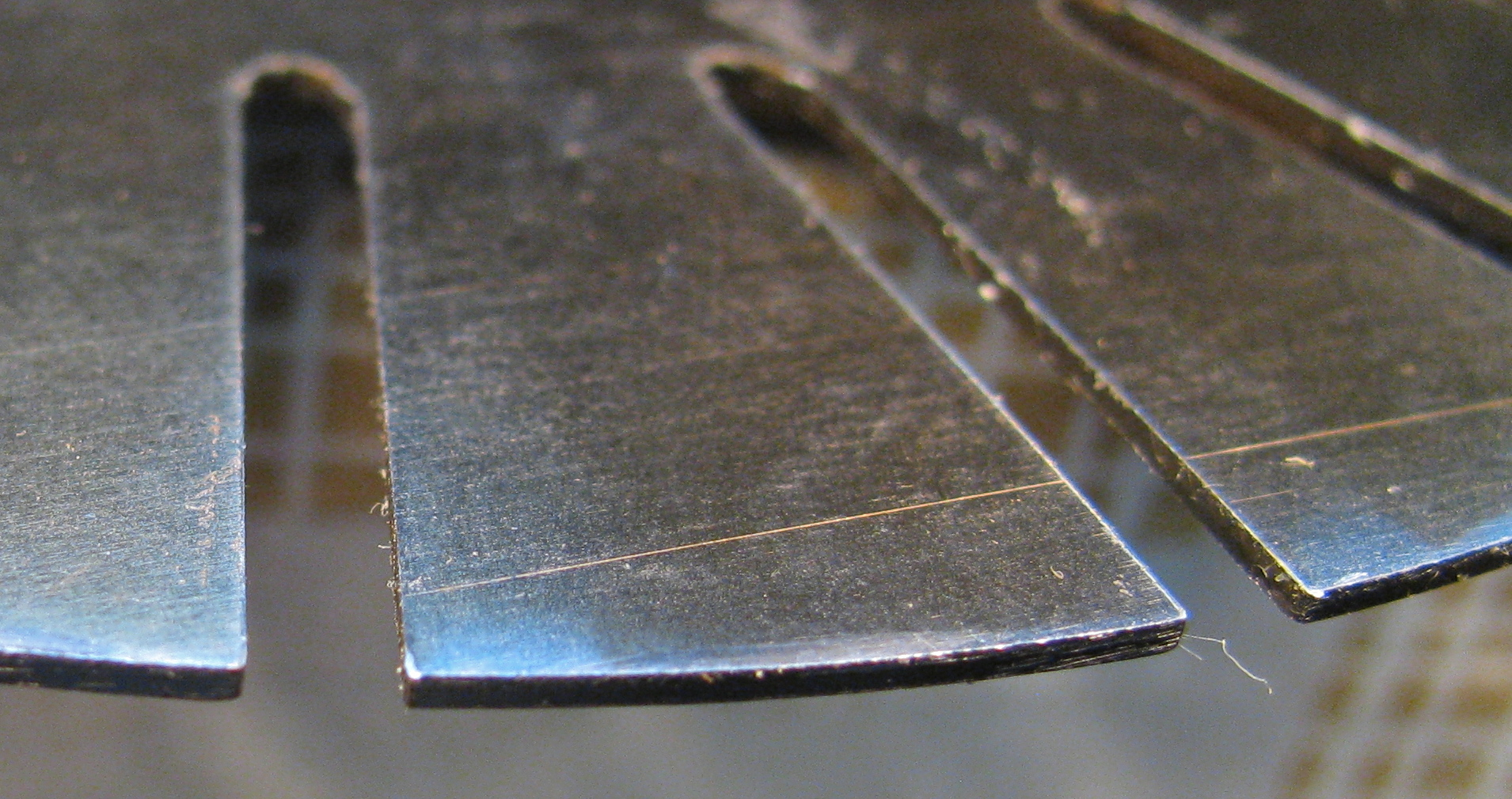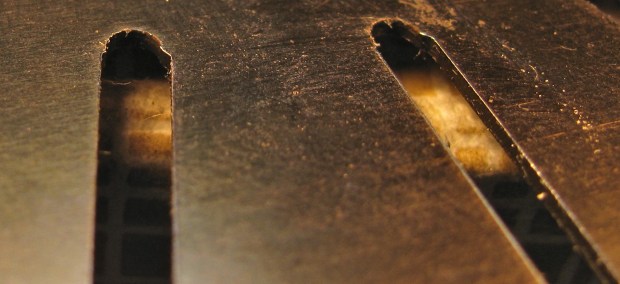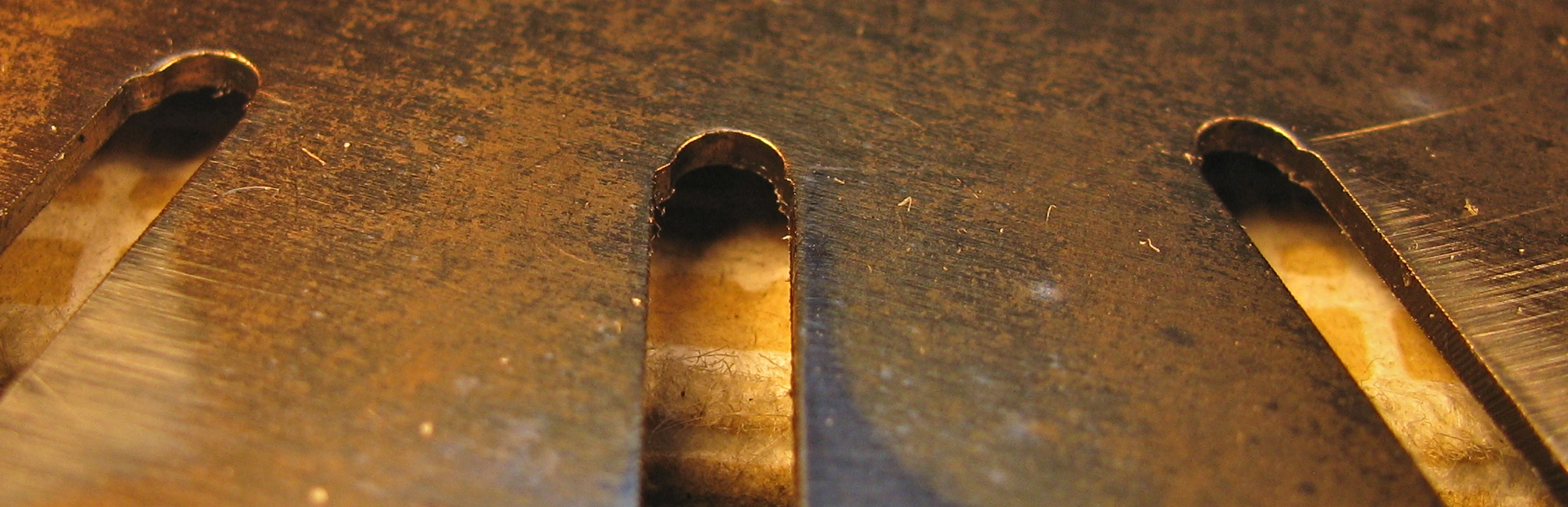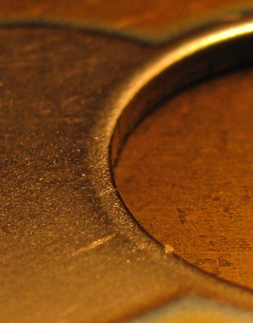 Some more images of the slots on the slotted plates of the VC. Any burr or ridge is not so clear, but perhaps there is one on the worn side of the plate. The series show the same plate, un-worn, then worn side. Clicking on the pics will bring up larger version.