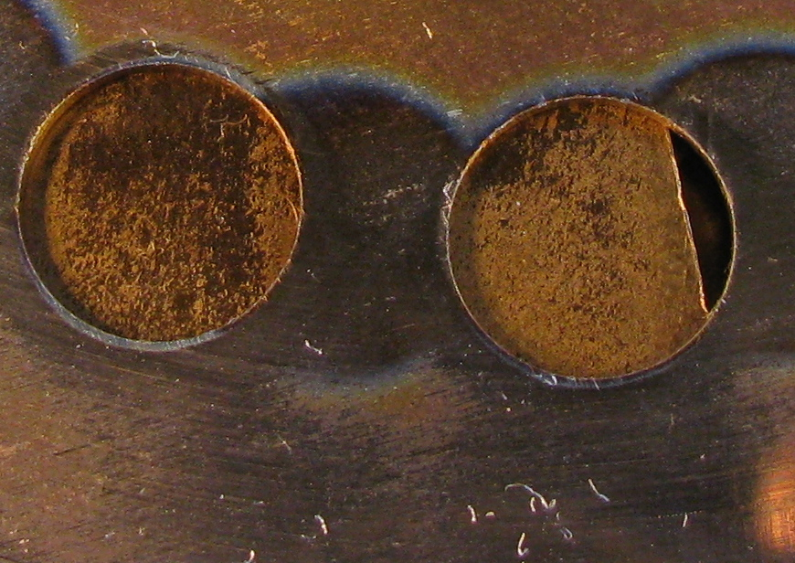 And a shot of worn plate holes. I think you can see where the rim/burr whatever you want to call it has been worn.