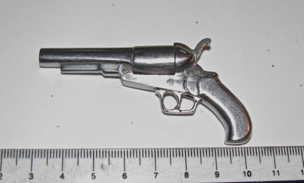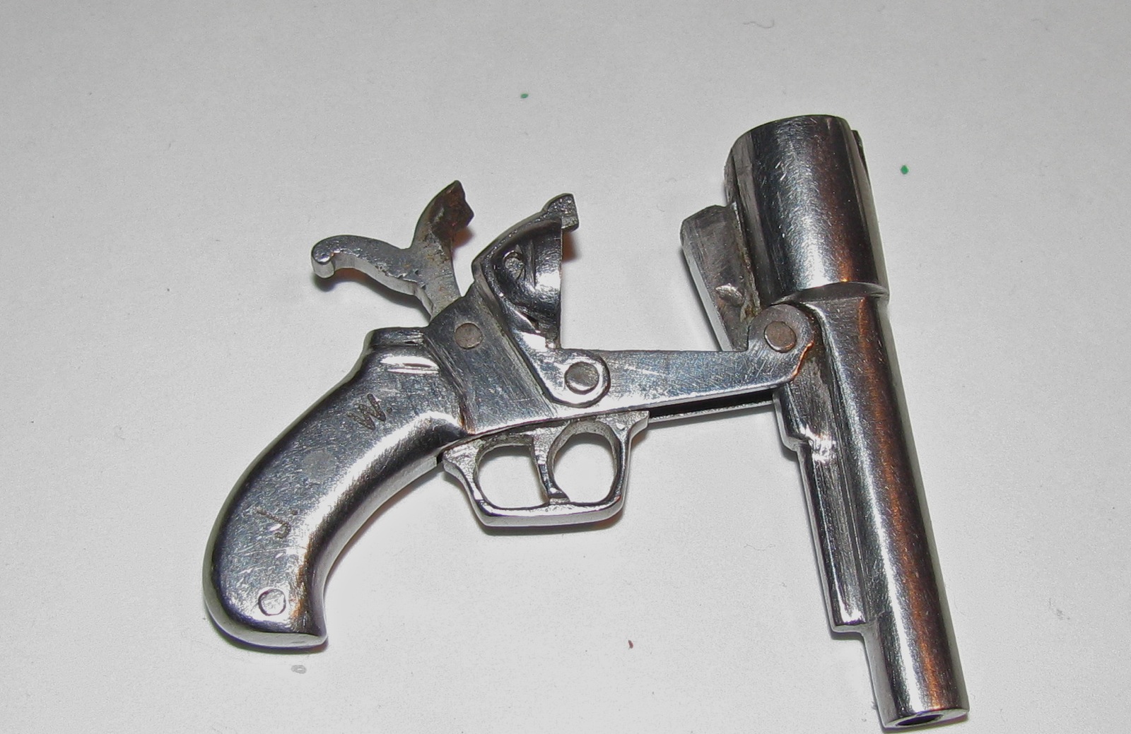 Made back in the ’50’s, couple of examples of the early work of a long lost relative of mine. The pistol seems to be chambered for a .22 cal cartridge, a blank of course. The hammer cocks and the trigger and guard act as trigger.
