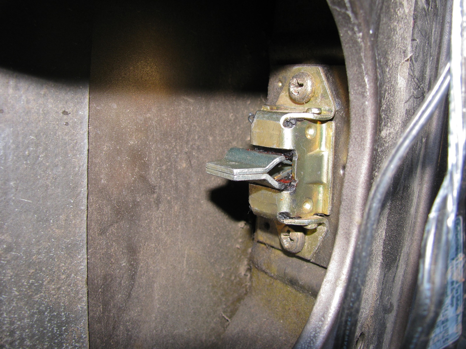After the door card is removed, you can see the check strap assembly inside the door. The ’86 has a plastic cover over the works, the old ’82 did not.