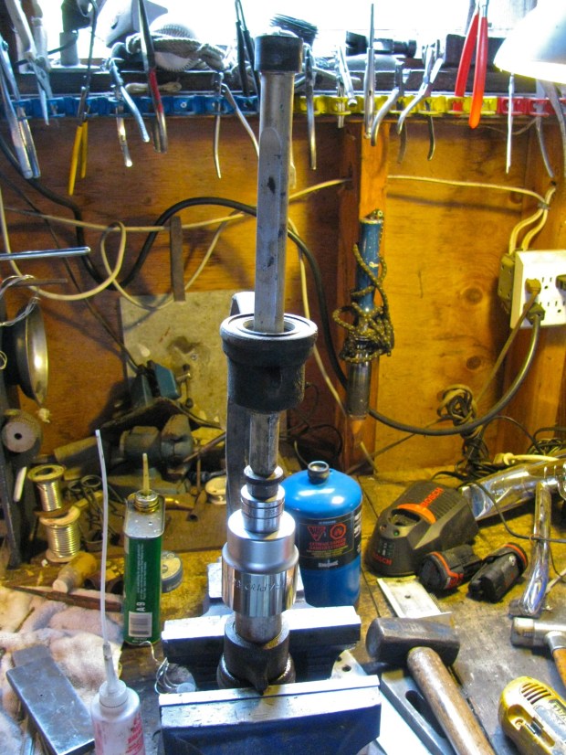 A bit of pop can in UCA to keep a large socket in place while bushing driven home.