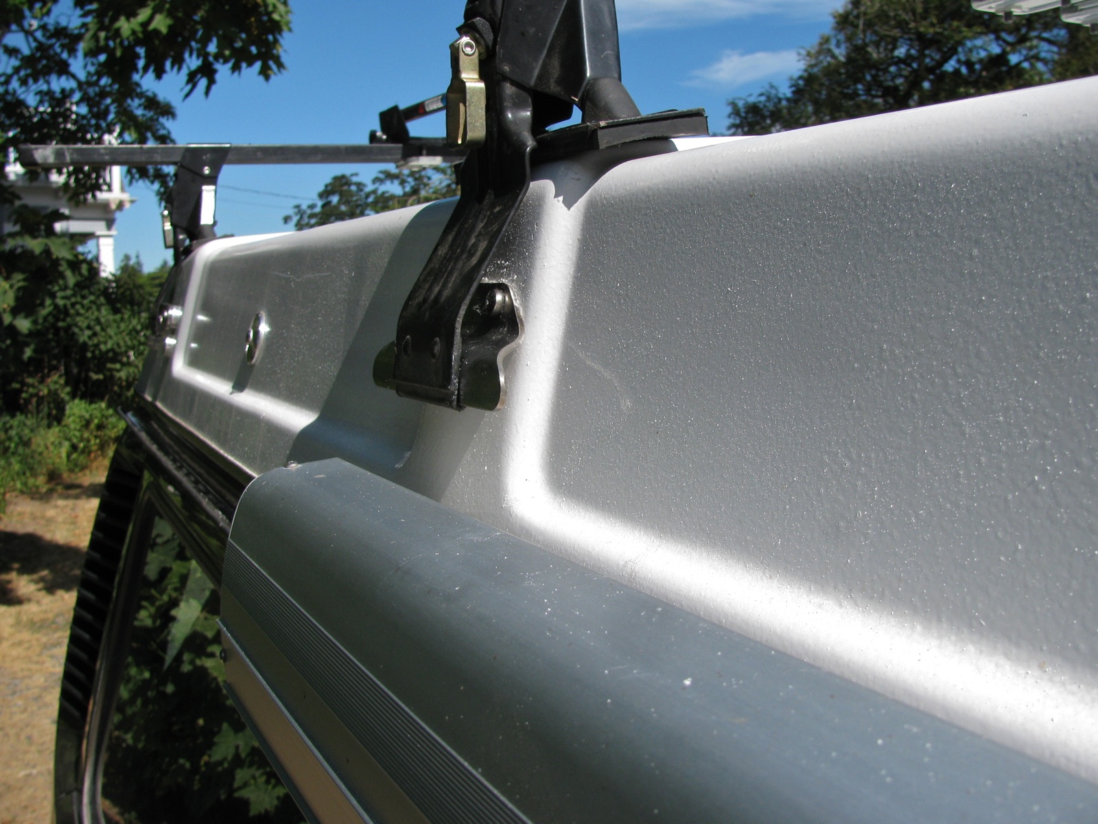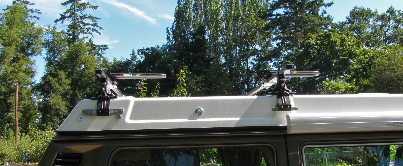 A bit of a kludge, but I wanted to get some racks up on the van to carry my son’s kayaks and perhaps a Thule roof box. My old towers that I used when the van was a tin top would have been pretty tall on artificial rain gutters mounted to the pop top. We had another Thule rack, used on my wife’s Subaru and is one of those “sits on the roof and clamps to door frame” types. I decided to use it but swapping in the longer bars from the tall tower set.