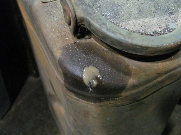 Have a look at this, a drop of Fluid Film (one of many around the workshop now) that fell onto the top of the new jerry can. I consider the grinding dust to be evidence of my hard work, not of sloppy housekeeping. Note the creeping wet spot.