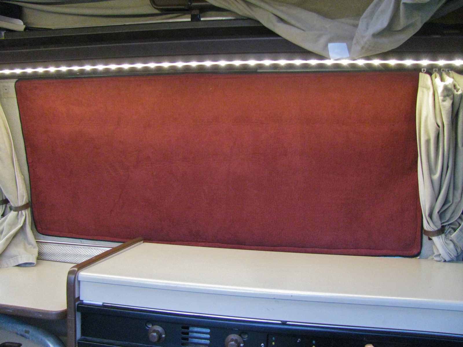 I had some led strip left over from the step protector project, and I wanted to get some light back at the hatch area. Sometimes we sleep with “heads at the hatch” (more of a summer rather than winter position, but what the heck do you care? :)) and It would be nice to have a reading light back there. A light also could be useful for finding stuff in the dark etc. So how to mount a strip of led lights back there? Well of course a bit of aluminum channel screwed to the back edge of the ceiling – in place of the T moulding – would be the way to go. But I decided I was smarter than that.