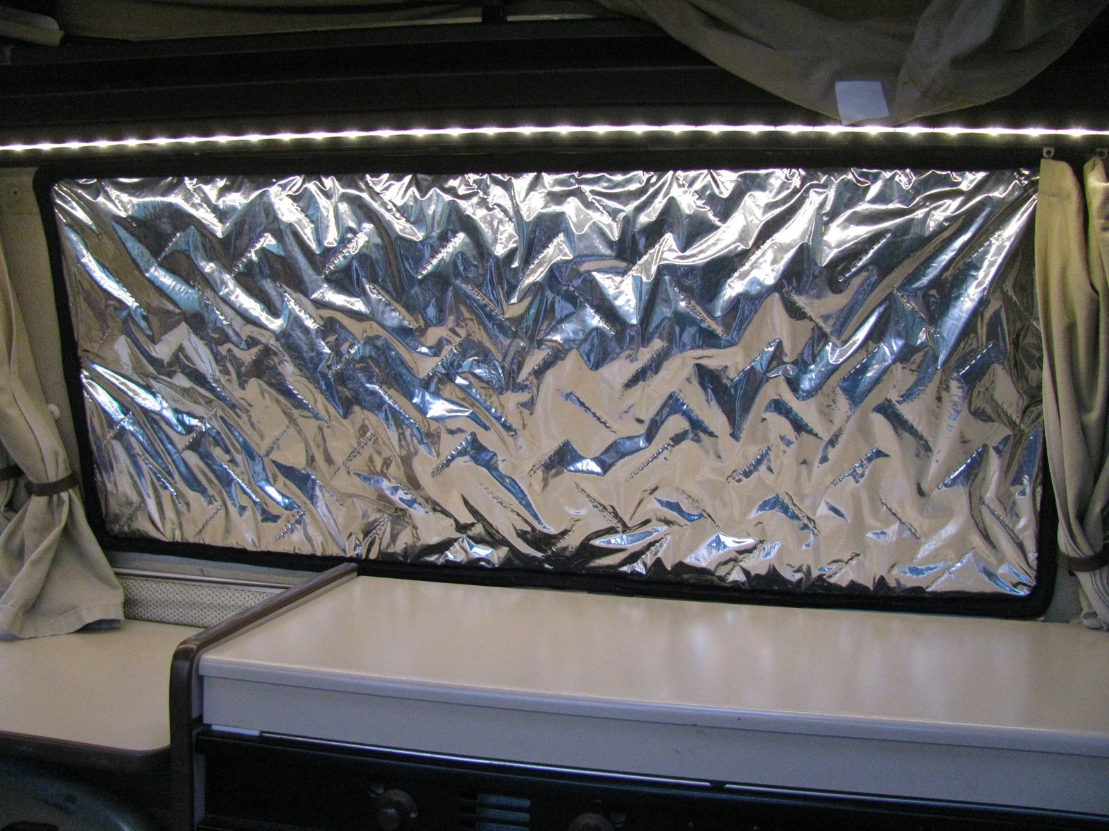 The idea was to be able to have the shiny side in for winter camping – keep the heat in, and the shiny side out for summer camping – keep the solar gain down. I had thought about using snaps to fix the blanket in place but magnets seemed more versatile. I think it turned out well.