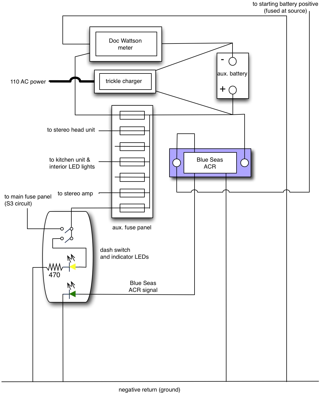 This post describes how I feed the circuits on #3 fuse from my auxiliary battery. And in this post you can see how I subsequently powered the radio with its own feed. So all that was being powered on #3 fused circuit was the map light, my footlights, glove compartment light, and the cig. lighter. Easy to see that putting a switch on that circuit would do the trick. But wait you say, won’t you want to have the cig. lighter powered all the time so that you can plug in a USB charger or something? Well, yes, I suppose. I’ll see how it works out. I’m wanting to add more power points in the van, the cig. lighter may become redundant.