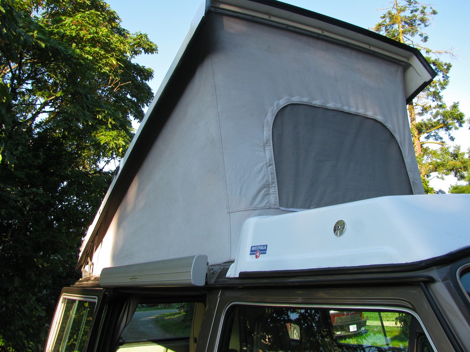 Long weekend here in Canada, and it was a warm one. Others might laugh, but out here on the wet coast hitting 30 C is warm. What better time to put in a different pop top canvas. The one I had on was from my old ’82 westy and it had seen better days. My wife had patched it up and replaced zippers but the time had come to give it some rest. Last summer I helped my friend do 2 canvas install and one of the old canvases was in pretty good shape. All it needed was a new bug screen in the window. My wife sewed in a no-see-um proof screen last year so it has been ready to go for a while. Why not put in a brand new canvas you ask? After all it is a pain in the ass to install the buggers. I am storing a brand new (Just Kampers brand) 3 window canvas for the aforemetioned friend, why not whip that in? First of all I think he would notice, secondly I like the way the stock VW canvas fits, the cotton material looks better than the Sunbrella versions inmy eyes (Sunbrella tops often drape like elephant legs). I guess the third reason is that the top was free.