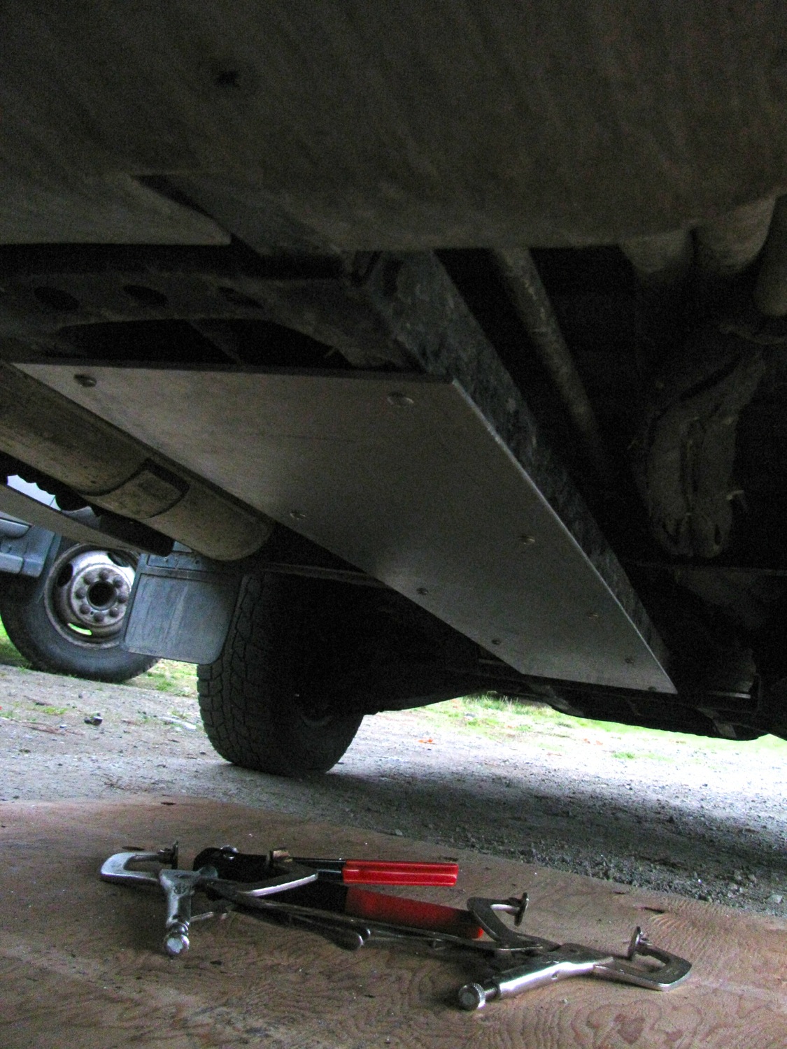 Even being in the doldrums, or maybe it was the horse latitudes, I have managed to do a couple of little things and this post is about something I did this afternoon. I had a bit of 3/16″ aluminum plate (5052 alloy) earmarked for propshaft protection. Oh I know what you are thinking, that’s not beefy enough is it? Perhaps not, if you want rock crawling type protection. But I’m just looking for something to protect the propshaft from flying sticks and stones and the occasional scrape over gravel.