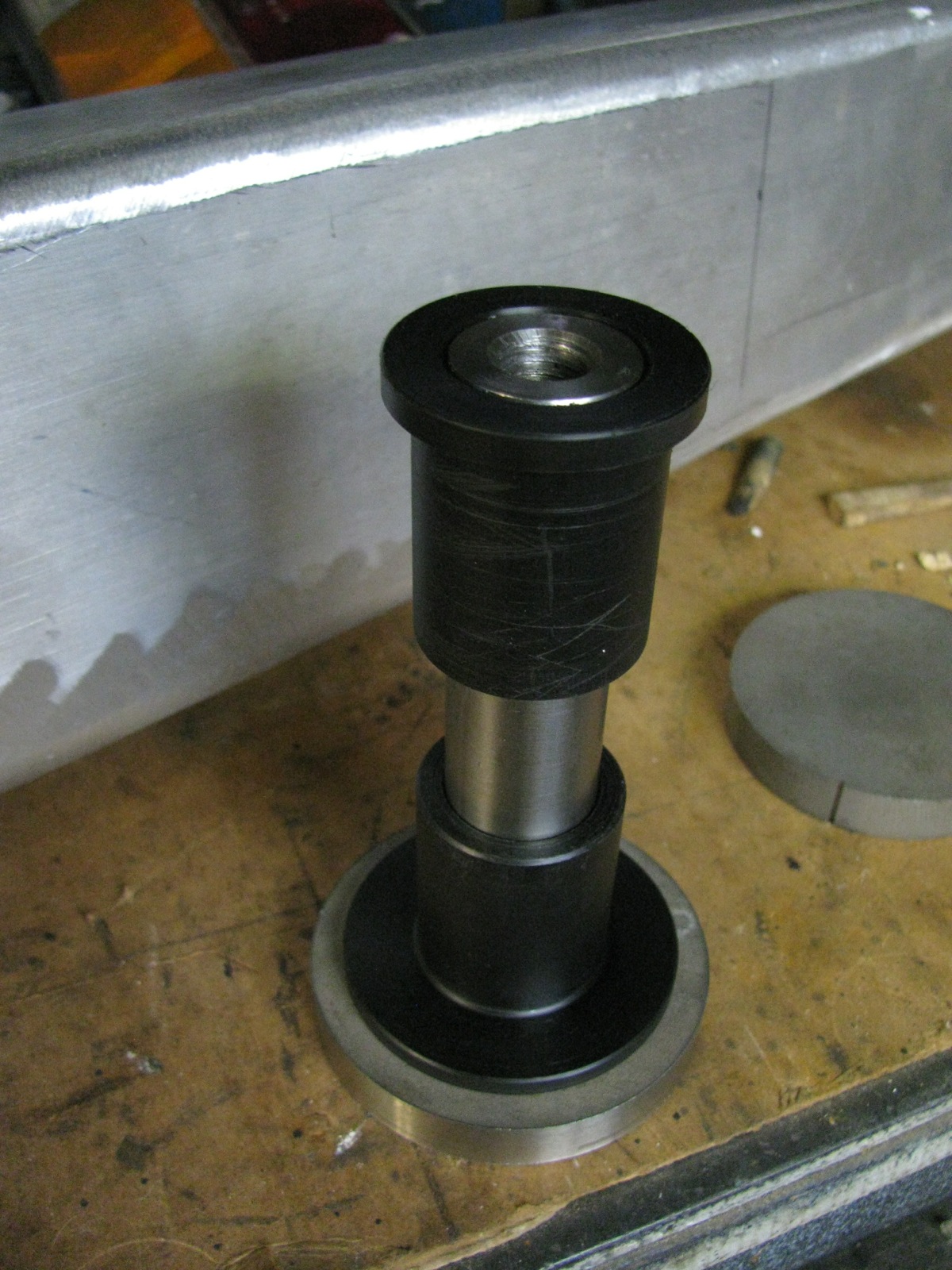 Bottom bushing is similar to top bushing but has a smaller flange. Here is top bushing being inserted into tube. The fit on the stainless shaft was a nice sliding fit, but the fit into the tube was tight. This resulted in the shaft having a very tight fit into the installed bushings, too tight really, so I had to take shaft out and take off a couple of thousands (inch).