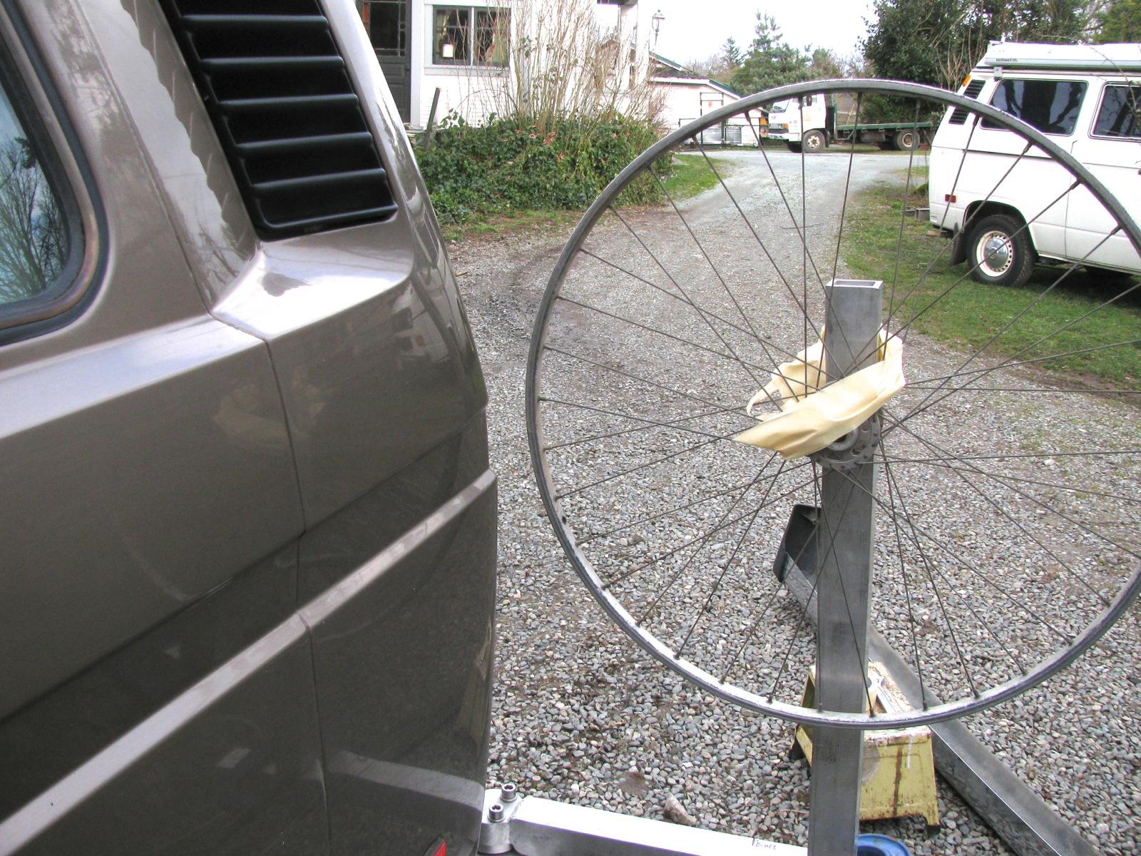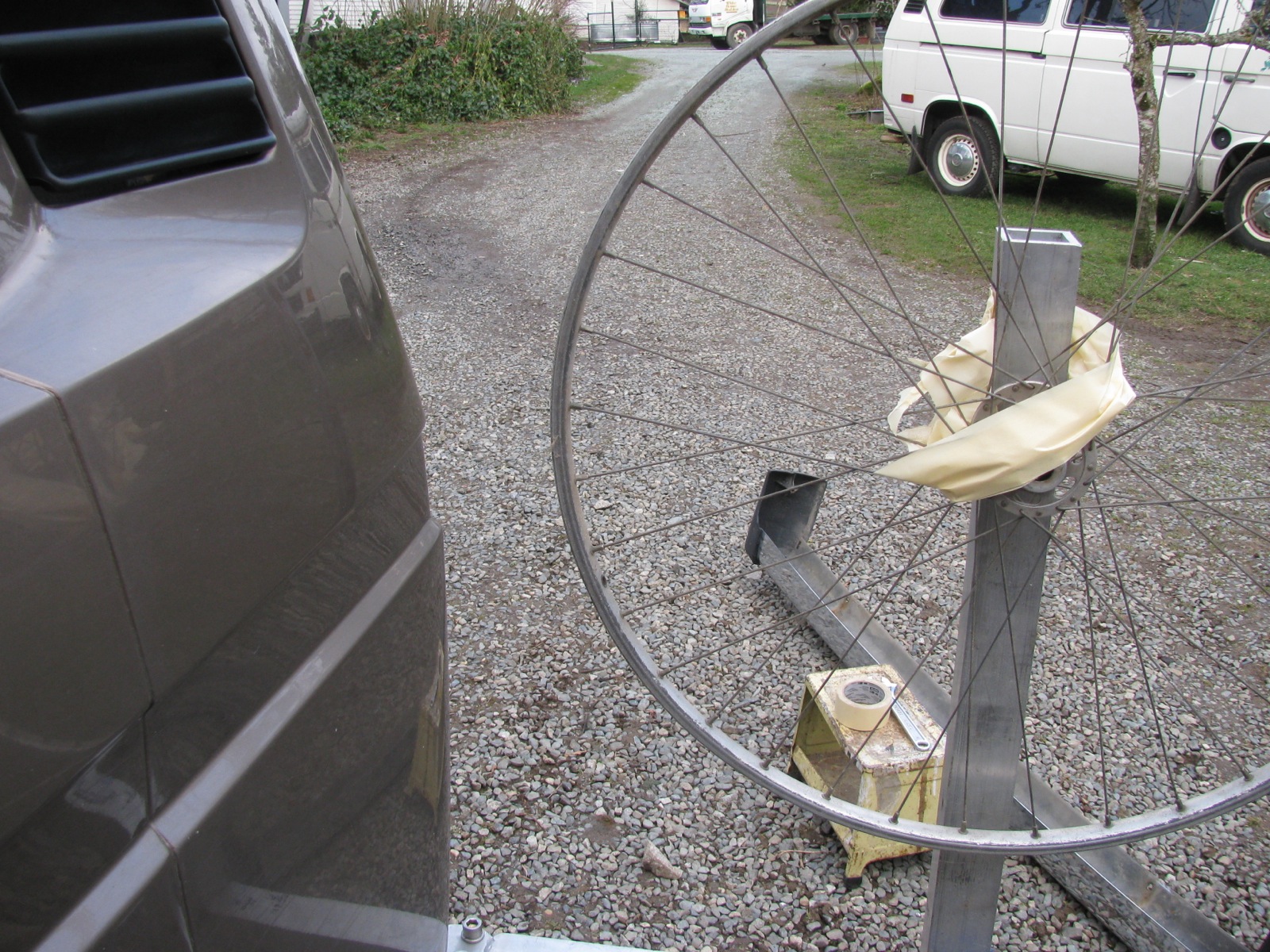 Now to determine where the upright should be positioned on the arm. I used and old bike wheel (25″ diameter) to help me decide. Now remember the bumper is sitting further out than its final position. So if I welded things up as shown, the upright would hit the hatch.