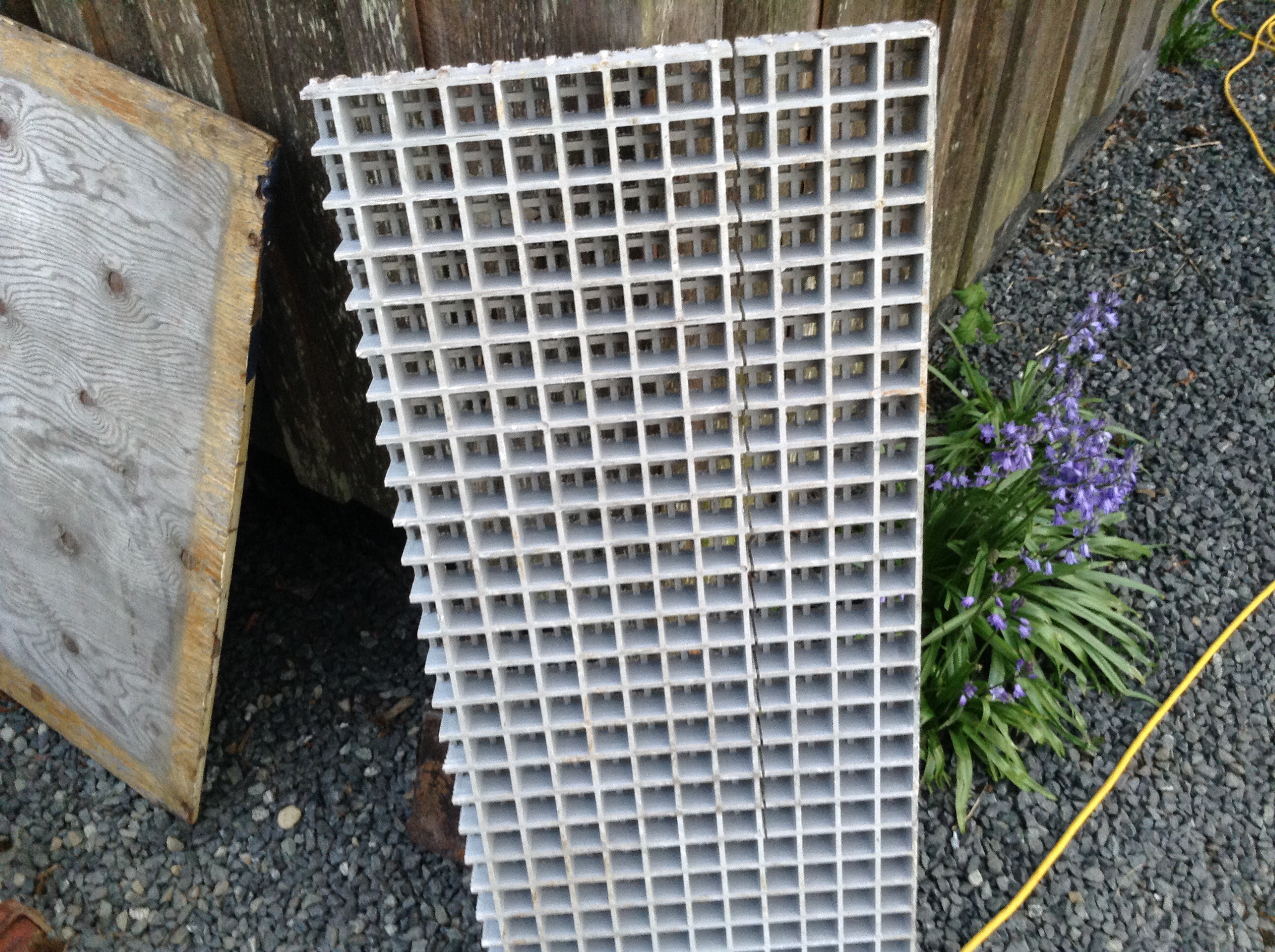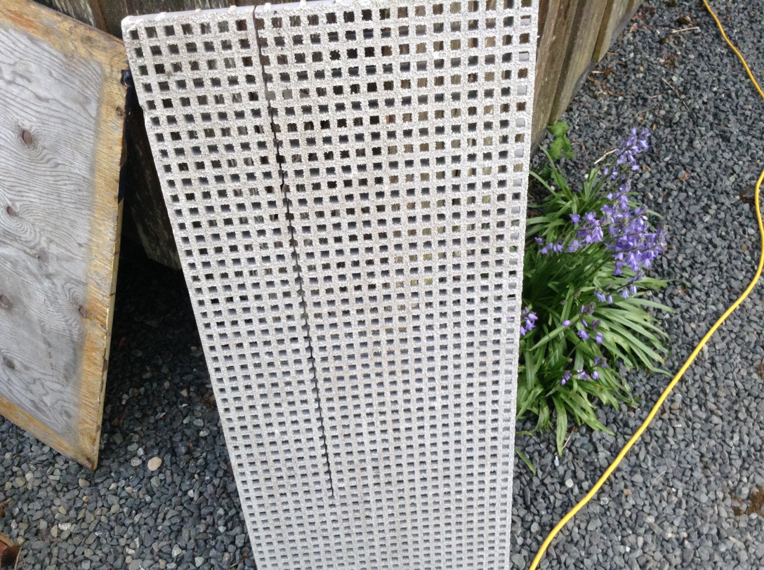This post is about a bit of fiberglas grating I picked up to use as a bridging ladder. I’ve been looking for off cuts of the is material for quite a while now and last week I finally found some. The source is interesting but I really can’t say where. This kind of bridging ladder is commonly used in the UK and Europe but I don’t see it being used much over here in Canada. Here is a link to a UK source.