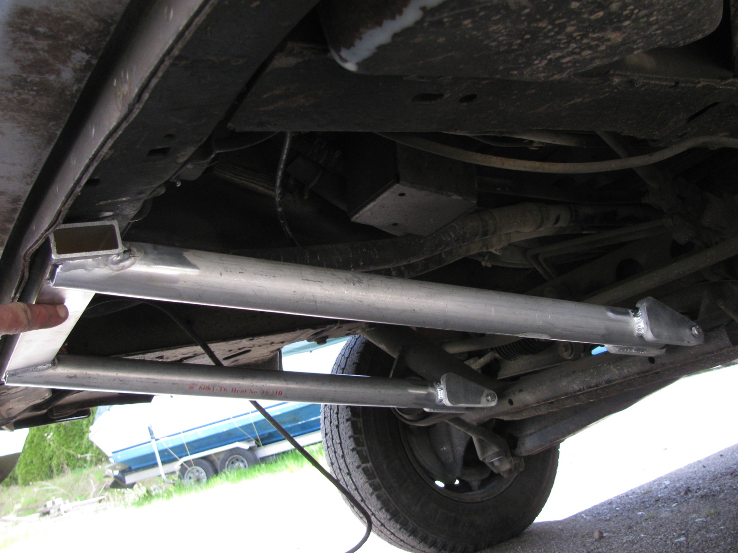 Not a great picture but you can see the notches I cut and you can see there is not only about 1/4″ of clearance between template and the pinch weld seam on the trailing arm. My template does not have radiuses corners so that might exaggerate things a bit.