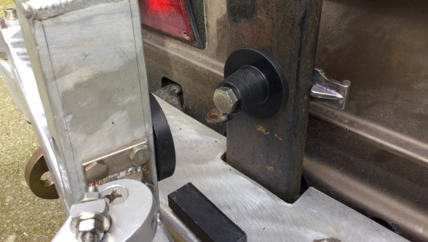 I still had the Delrin cone and socket arrangement that was for my first design. The cone and socket does work well to locate the arm to the steel back stop that is welded to the bumper subframe. So I kept that and made a draw latch.