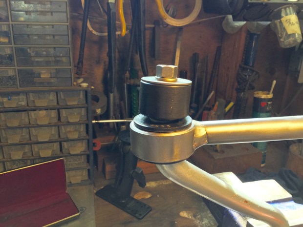 Some tubular spacers, lube, and a nut and the bushing ( already fully seated in the drop link by squeezing the two together in a vise) and hey presto, the bushing and link can be easily pushed on to the sway bar. Hey don’t rely on this pic for correct orientation of the sway bar bend to the sway bar, I was just doing a test run and didn’t take care. I did get it right in the final assembly… I think 🙂