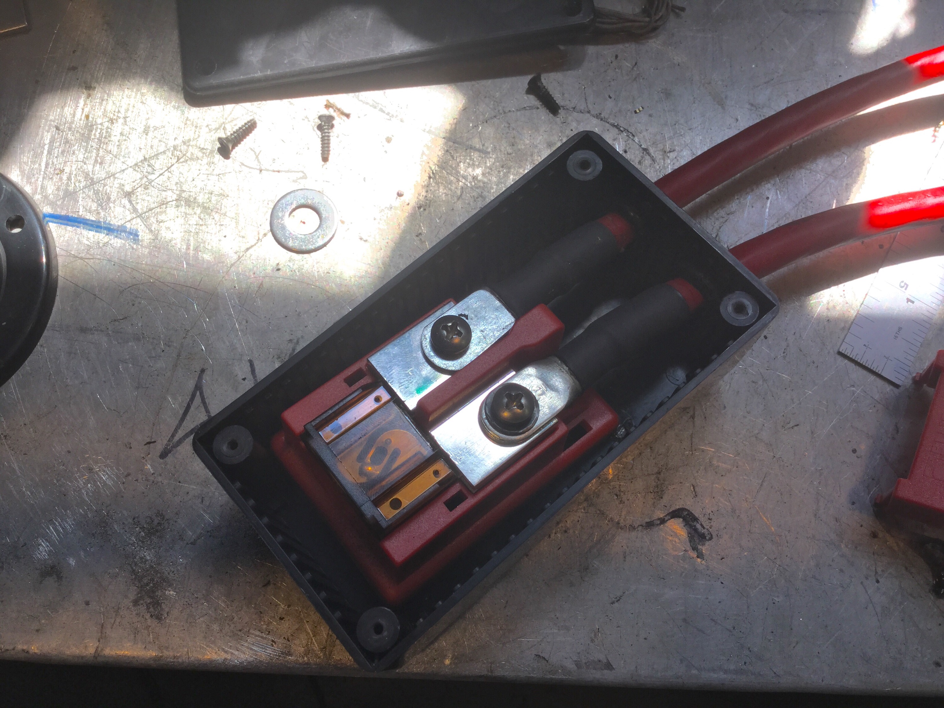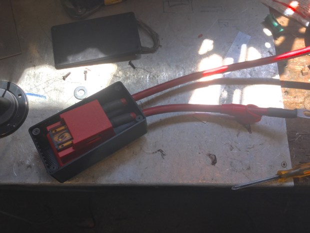 It’s not great but it’s not bad. It’s just there to reduce water splashing on the battery. Not shown in the pic are tubes leading from the battery vent up over the battery and on up to behind the front grill. When I did that I was thinking I was clever, I thought that leading the vents up high would prevent water getting into the battery if I happened to go through a deep puddle. But I found out later that the battery vents have a valve in them to prevent water ingress. A note on the wiring. I ran a short length of 4 gauge wire from the negative terminal back to the bolt holding on the transverse member supporting the front differential. On the positive terminal a short length of 4 gauge comes off the terminal and up into a black box (attached by Velcro) on top of the battery. In that box is a Blue Seas Maxi Fuse block, with a 70 A fuse.