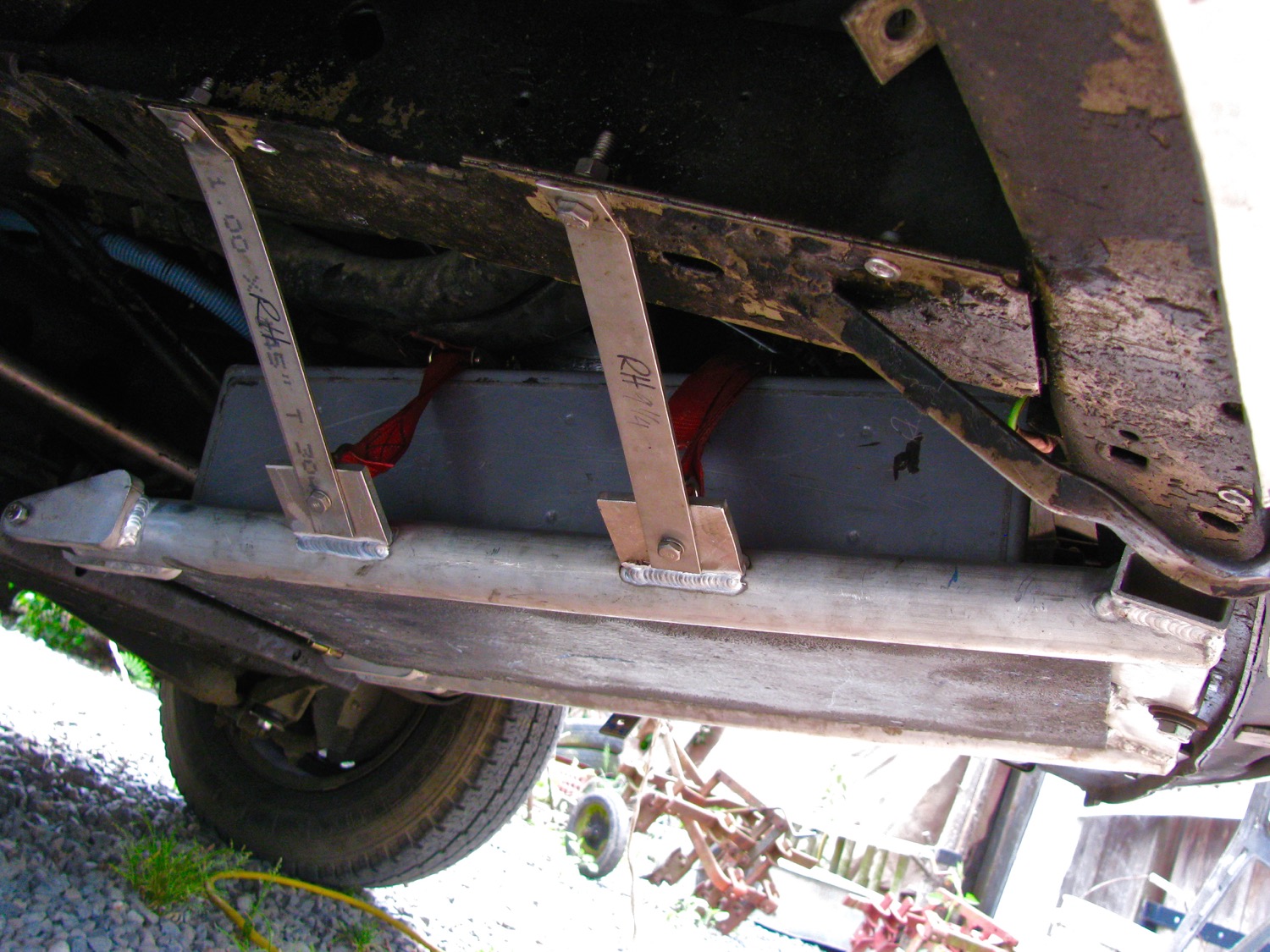 It took longer than making a baby but I finally have my big battery installed. I got this Northstar 200 AHr battery some time ago, I think I mentioned it in this blog post. The size and shape of the battery made it seem like it would fit easily under the rear seat but it just doesn’t ( without taking up more space than it needs, if that makes sense). I toyed with the idea, and went as far as making brackets, of mounting it up under the van between the door sill and frame rail but no, that didn’t look right. So I settled upon the admittedly dubious spot of where the spare tire sits. A couple of problems with this placement. Number one is that I now have to find a spot for the spare tire. Ah but what about my much talked about swing away spare tire carrier? More on that at the end of the post. The other dubious characteristic of this battery location is that it places 128 lbs forward of the front wheels. I’m a little worried that it might make a difference in how the van negotiates dips and ditches in logging roads. Skipping a head a bit, I have had the battery installed for a week and I really don’t notice any driving different on paved roads. I made a carrier for the battery quite a while back, crikey, it was a year ago, since then I welded in some locating brackets that the battery fits into, and some tabs on the side tubes for supporting brackets. The brackets are made from 1X1/8″ stainless and I bent them to fit to the van frame rails. They are secured to the frame rails by 5/16″ stainless bolts that I will someday change to 8 mm. The bracket to the tab connection is done with 1/4-20 bolts and instead of nuts I used stainless ring nuts. The rings are to secure nylon straps that cross the battery and hold it very securely to the tray. Ok, some pics of it installed. First pic taken from driver’s side, one stainless bracket not fastened. Gives you the general idea of how the battery lies.