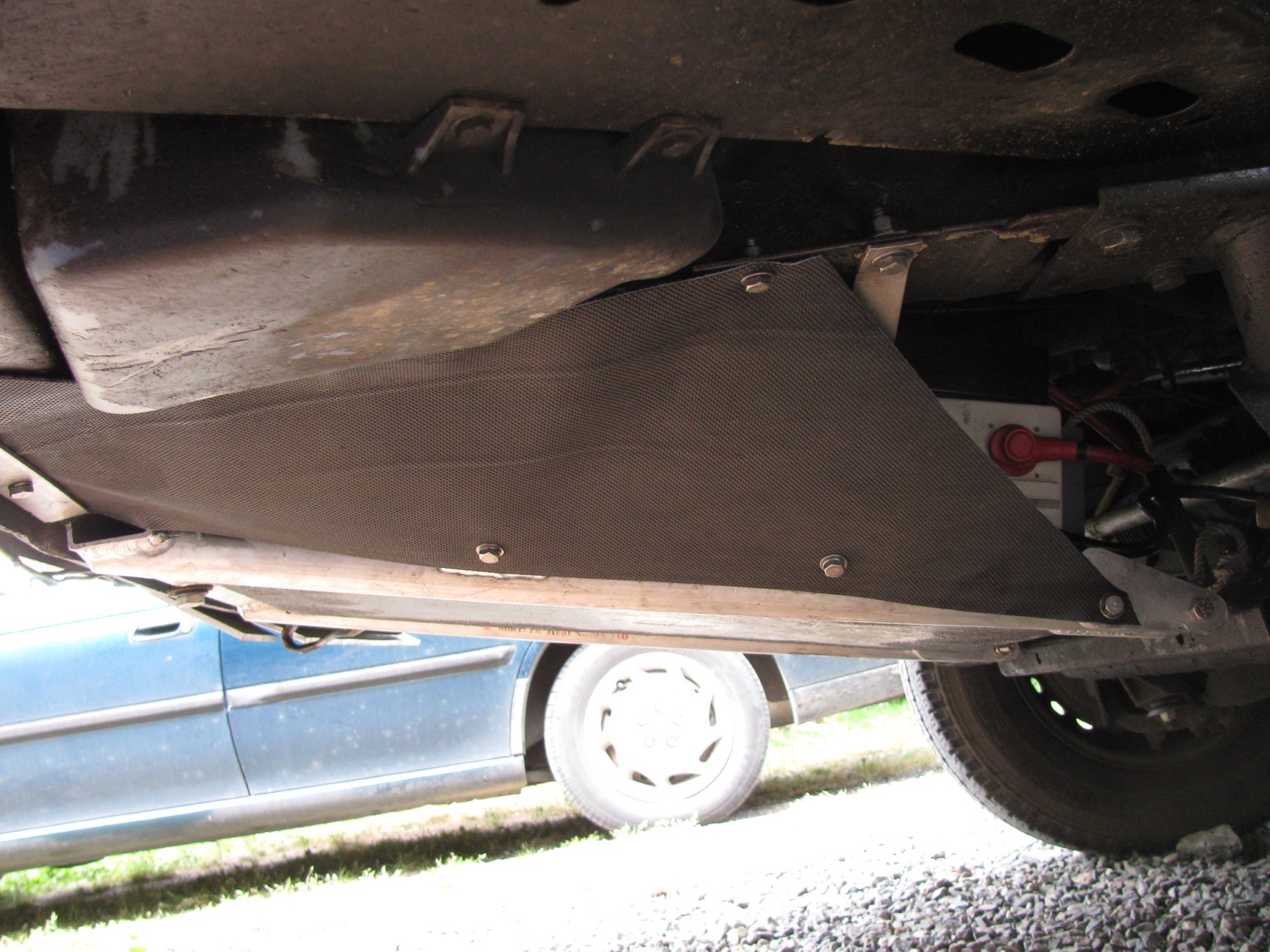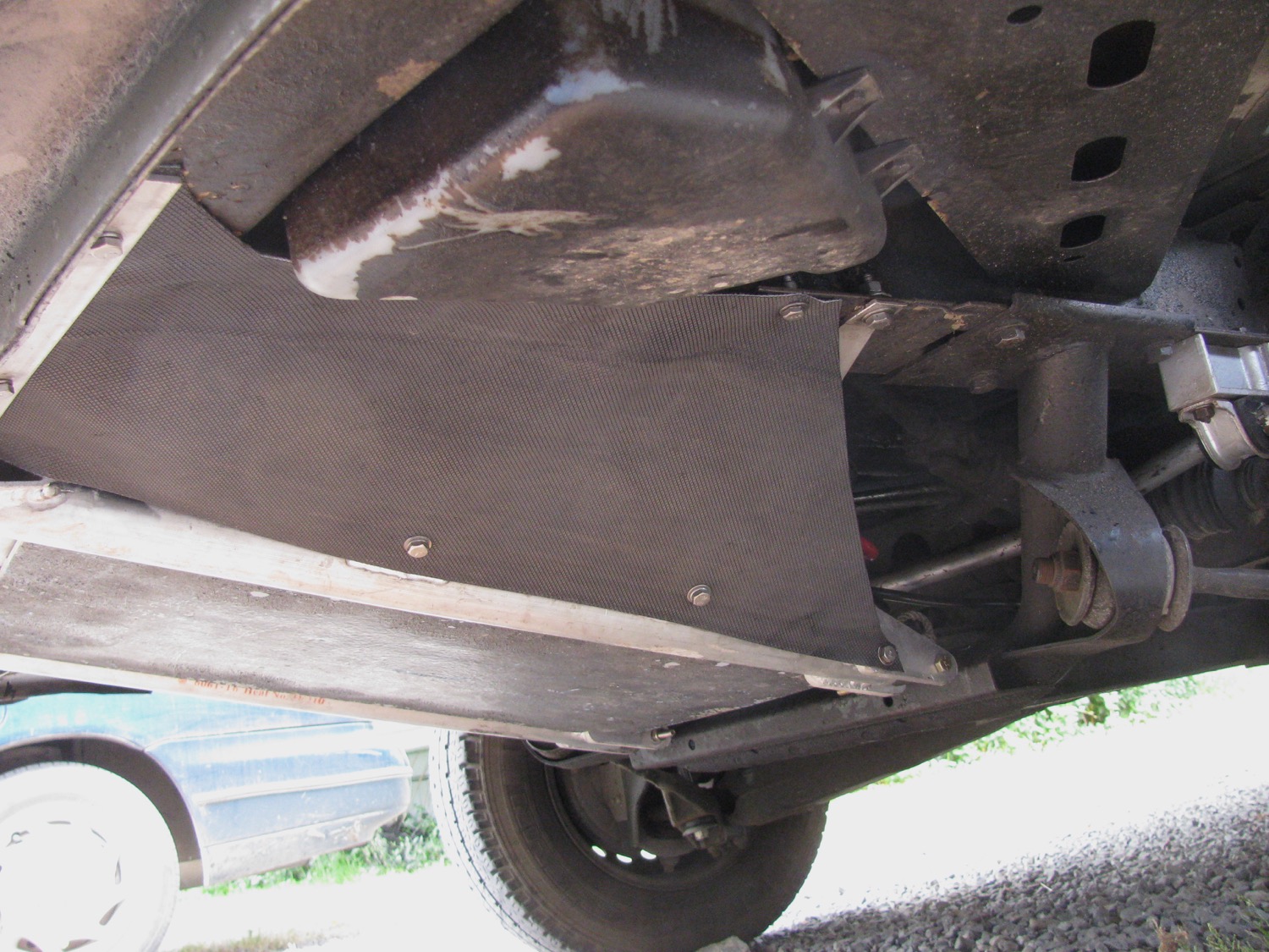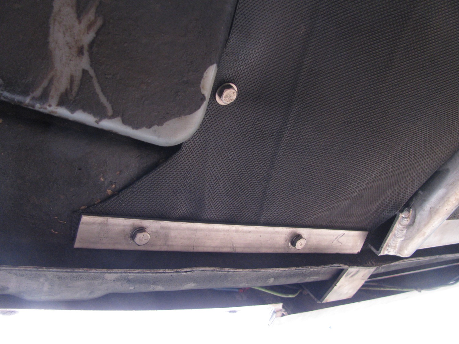 I had thought of making aluminum side splash plates but I was dissuaded by the changing angles and company curves needed so I used some scavenged treadmill material. I installed 1/4-20 riv nuts in the existing holes in the van frame and bolted the treadmill material.