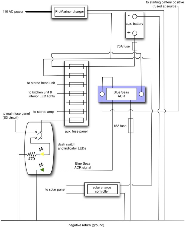 I redrew my schematic to show changes made in the last year. I dropped the Doc Watson meter, added solar panel controller, and added large fuse at the big aux battery. And I added a 15A fuse on the small wire that runs from the ACR to neg return. It’s a safety in case of an internal fault in the ACR. Also, I corrected mistake in last diagram where the ACR was connected incorrectly to the aux fuse panel. Now you see it is fused at panel. I should make it clear that I do not have a power feed to the fridge cooling system. I may add that later, but I don’t miss it.