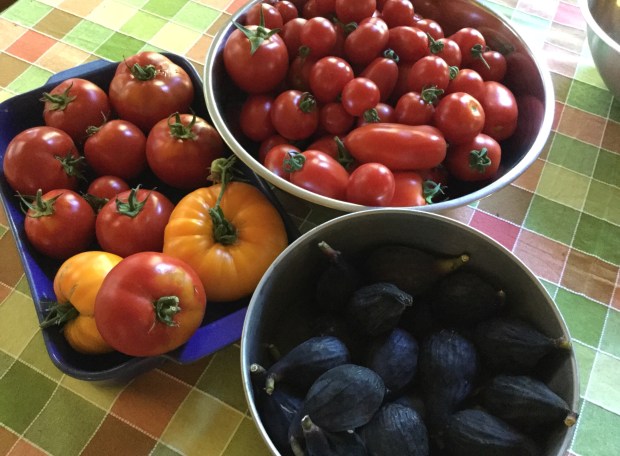 It’s a big tree now, but started as one shoot in a half wine barrel 22 years ago. Pumping them out every day now. Some to be frozen till we have time to make preserves. It tickles me to have a fig tree in the garden, it’s like we’re living somewhere exotic.