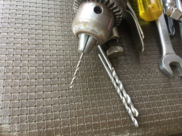 I’m pretty close to the centre of the bolt. The bolt stub is not centred in the middle of the sheet metal. When I am hand drilling ( as opposed to using the milling machine and having the work held firmly) I like to enlarge the centre punch mark with a small drill bit. No need to drill deep. The small drill easily finds the centre mark. Then I drill with a larger bit, right through. Finally I use a bit just slightly smaller than the bolt diameter, in this case it’s a 6mm bolt and the largest bit in the is pic is 7/32″, or 5.6mm.