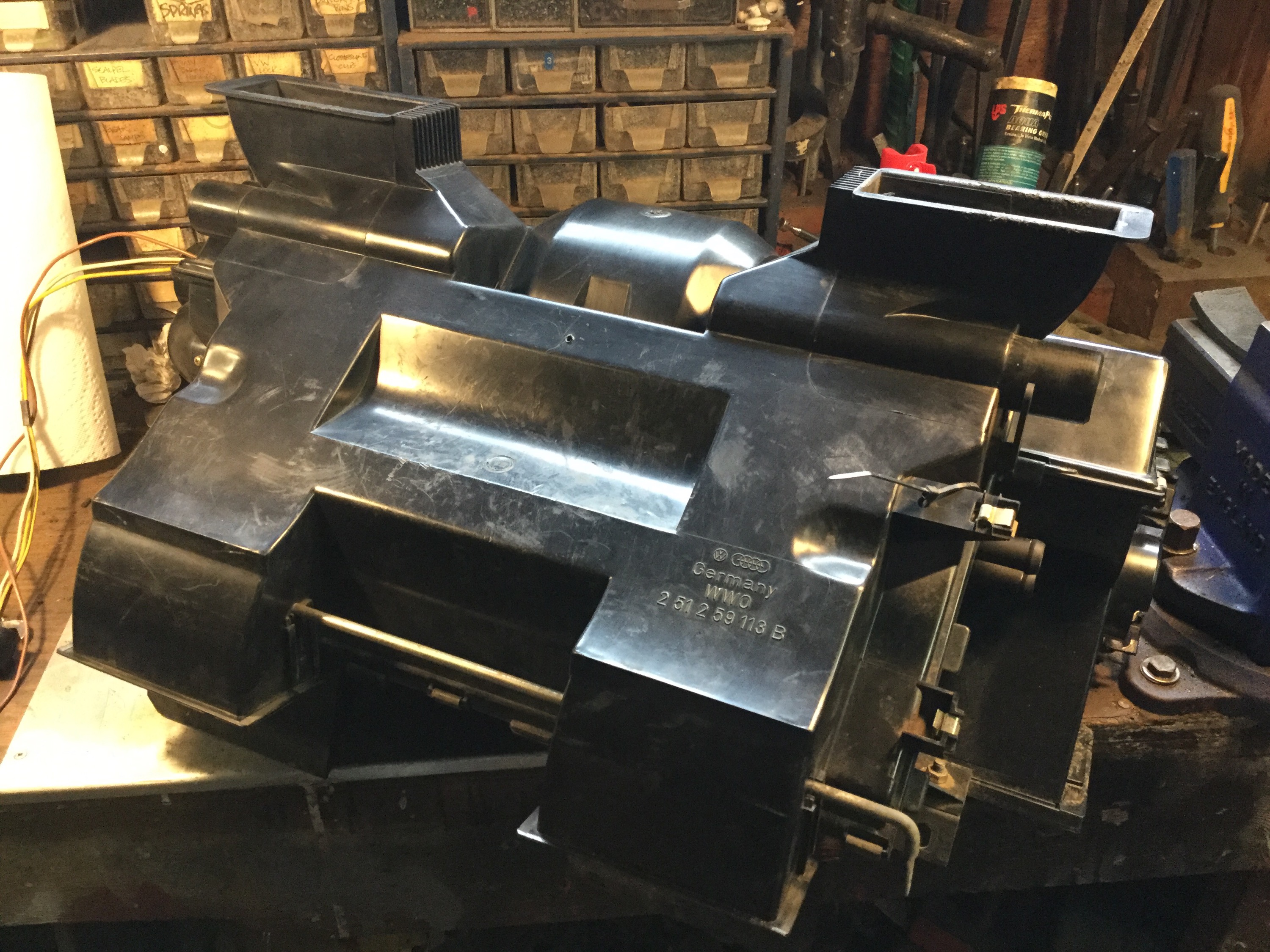 Hey look at this heater box. I think my 82 diesel Westy was the same, and that is the box is not welded together at those tabs. Yeah, there were metal clips, but no plastic welding. My 86 syncro and Simon’s 91 syncro heater boxes had the halves welded together.