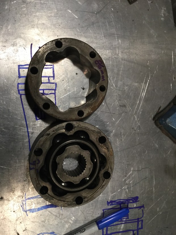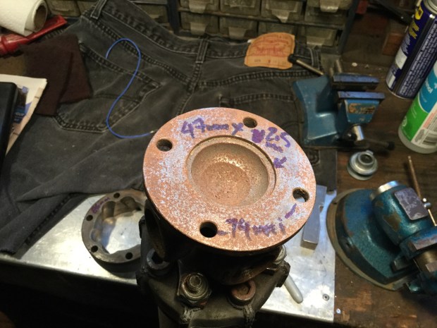 In reply to Hans’ comment about CV jointed prop shaft. A couple of pics. First is the flange of my spare propshaft. Approximate measurements make it a 74mm bolt hole circle, the recess is 47mm diameter and about 2.5mm deep.