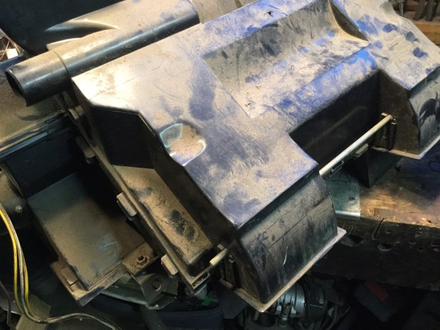 The fan motor was seized. I did loosen it up and I click get it to run, but it will be replaced. The foam on the flaps was all disintegrated. The heater core was dirty but sound. I’ll get back to the box later, next post will be about the pedal assembly.