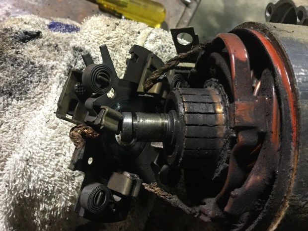 Brushes worn down to a nub. Commutator burned, dirty, ugly.