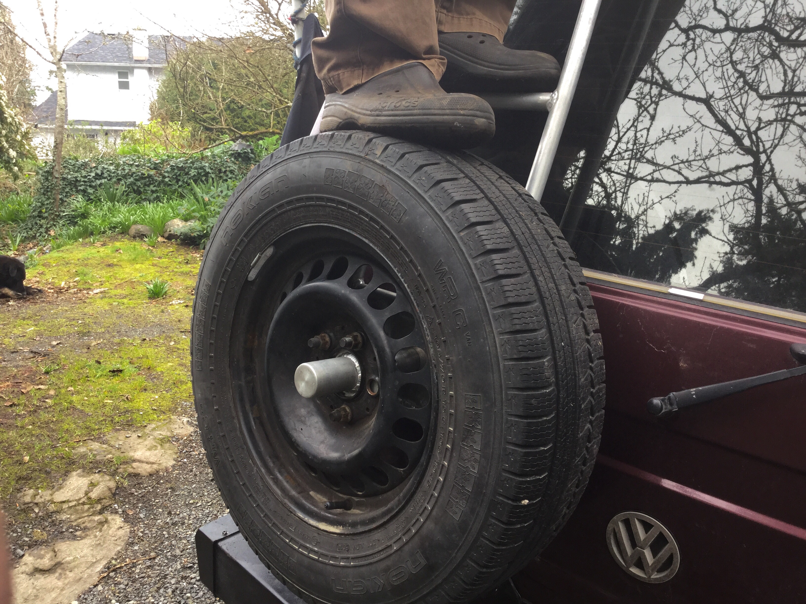 It still works as a ladder with the tire on. Step up from the RMW bumper onto the tire.