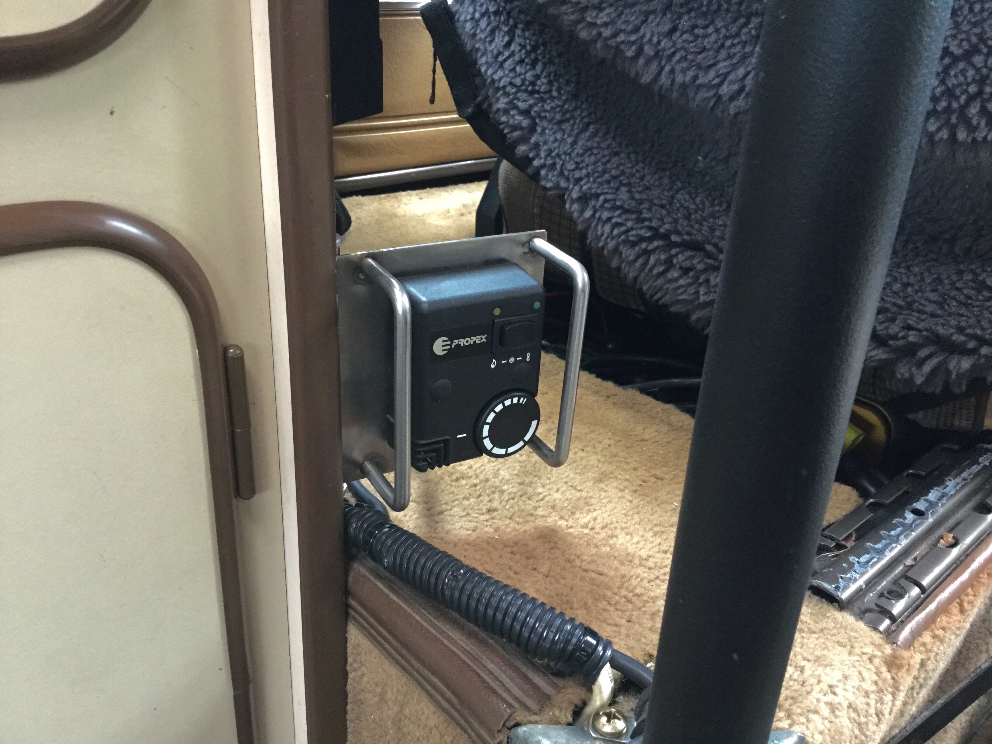 Now the thermostat, where to mount it? Constraints be two. First is I couldn’t be arsed to find some replacement 5 wire cable so I reused the original but with the fire damaged section cut out and the the cable spliced. So the shorter cable limits the range of thermostat placement. Secondly, the cable enters the thermostat from the rear, to make a clean surface mount. That means a hole drilled somewhere and the cable routed through God knows what. Instead of a surface mount I made up a very crude swing away mounting plate from some stainless and added crash bars. Mounted this on the forward face of the kitchen unit, right behind the driver’s seat.
