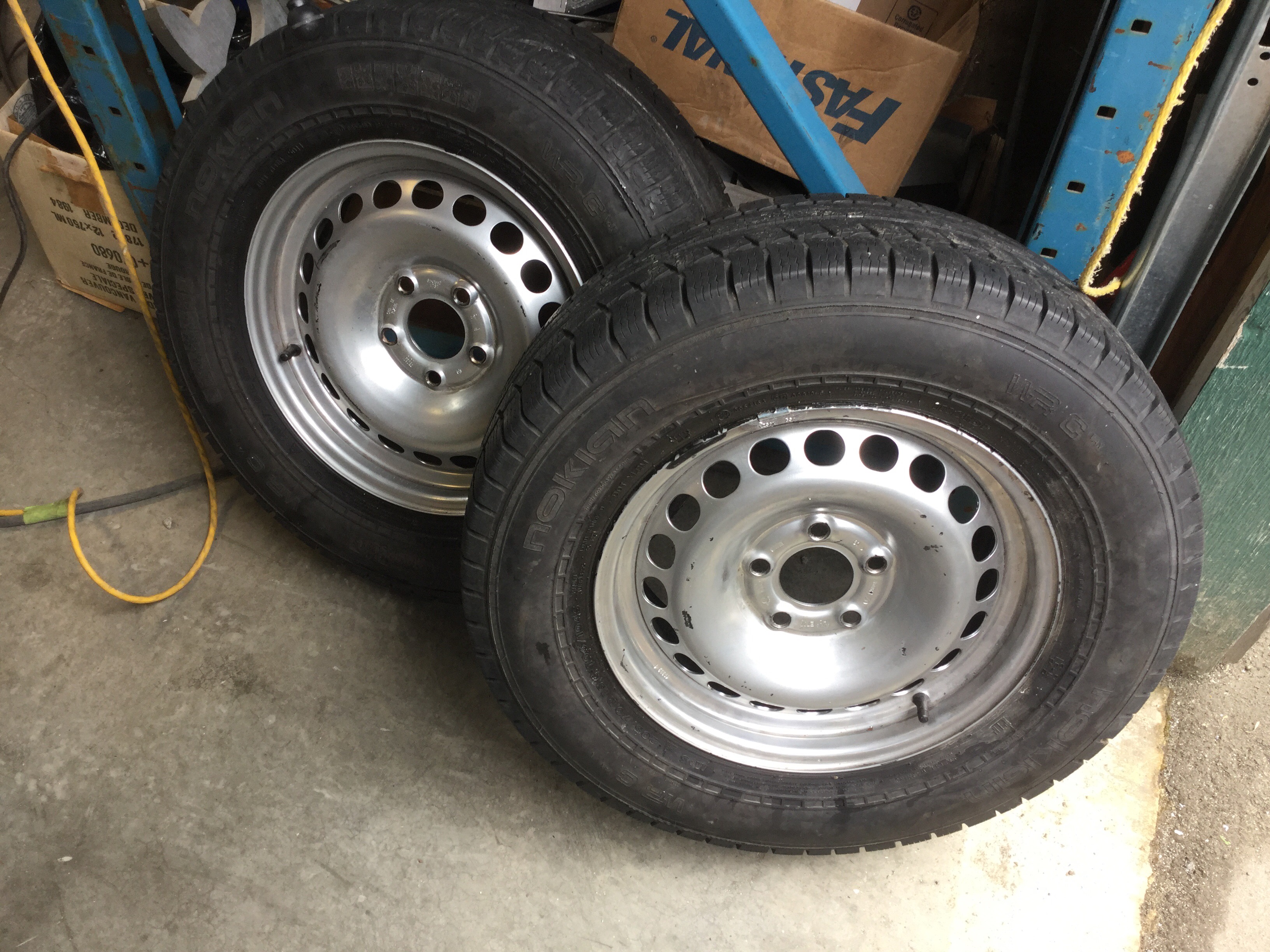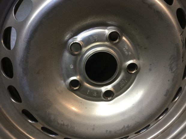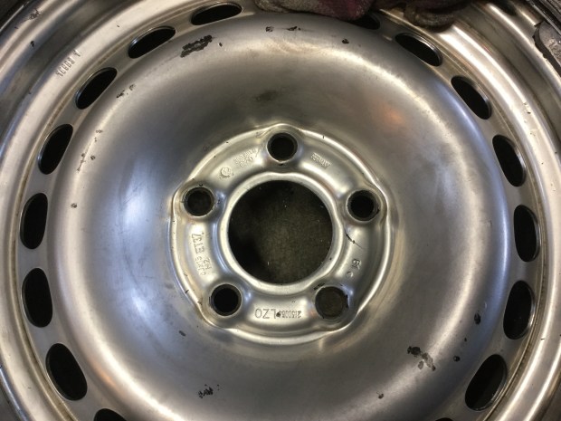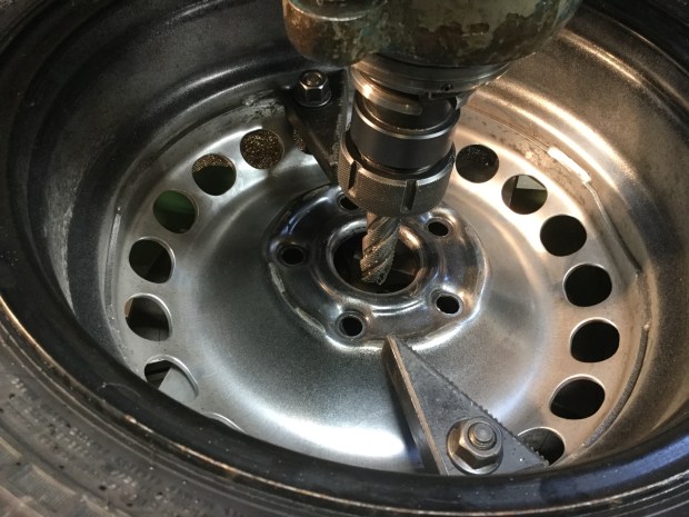 One of the improvements is better wheels to replace the stock 14″ that the van came with. Simon found four 15″ steel wheels but the dolt went ahead and had tires mounted before the centre holes were opened up. I’m still cursing him for that. Without the tires I could have mounted the rims on the big lathe and the job would have been a snap.