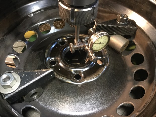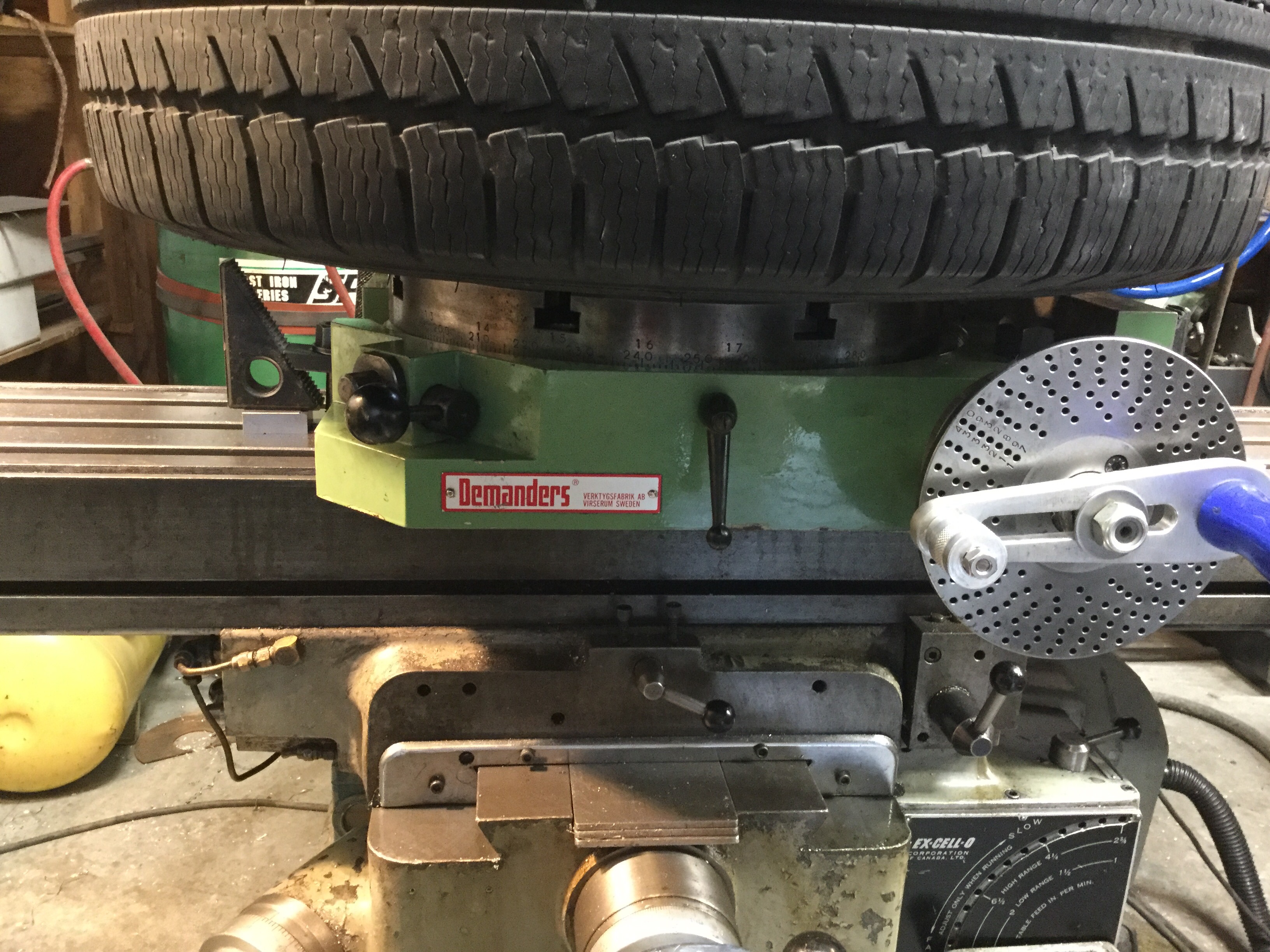 As big (and darned heavy) as the rotary table is, the tire and wheel is bigger. Wheel on the table with inside face up, and the outside face sitting on blocks on the table so that the tire is taken out of the clamping set up. Not a great shot here, but you get the idea.