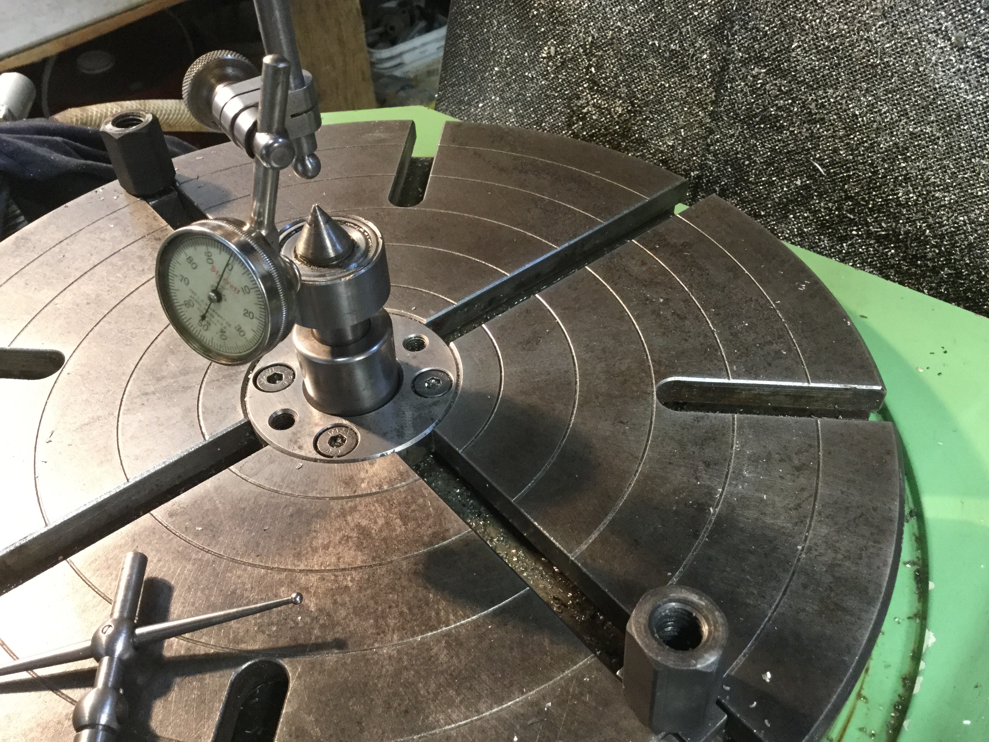 Clamped the wheel down onto the table just lightly and then I indicated the hole, got it pretty well centered ( again, around 1-2 thou) and, as the British would say, nipped the cramps down firmly.