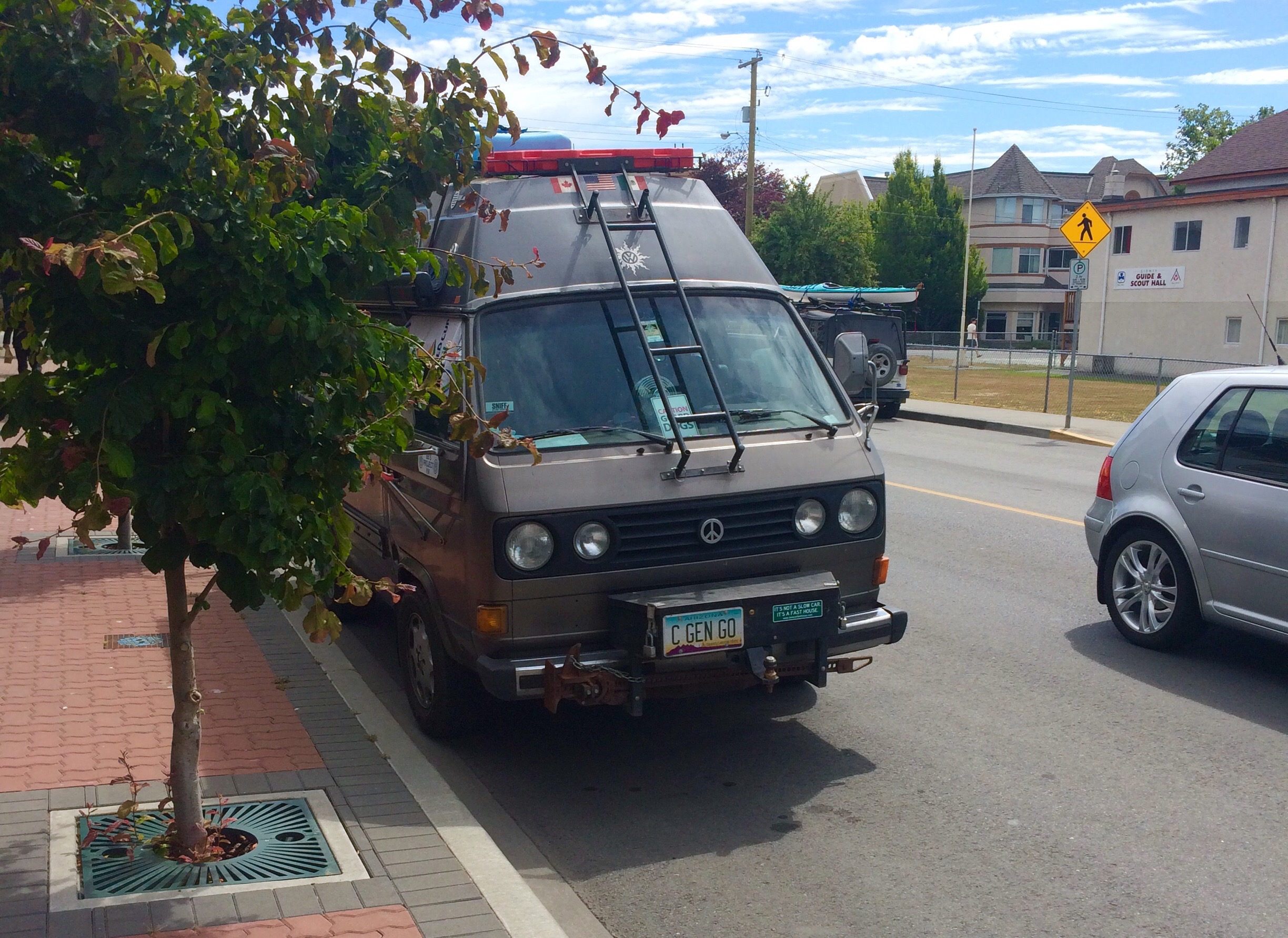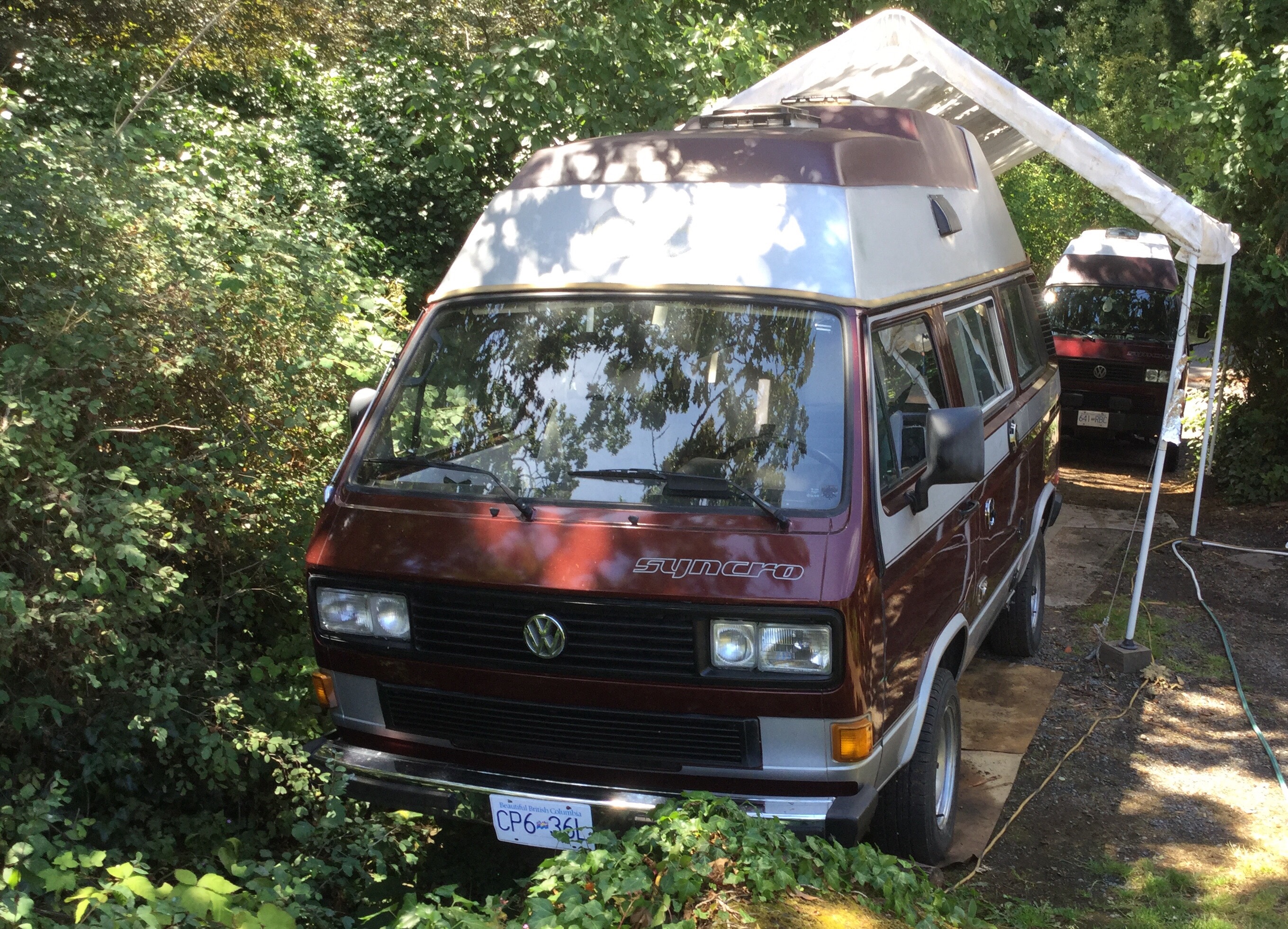 Yes, this is Simon’s latest find. 88 syncro high top. Getaway van conversion, done over on the mainland (BC). I’ll have more to say about this van and pics of the interior when Simon is finished tidying it up. It’s a good looking van, and only 82,000 km. The bored out wheels look ok on it, but we both agree it needs about an inch of suspension lift to perk it up.