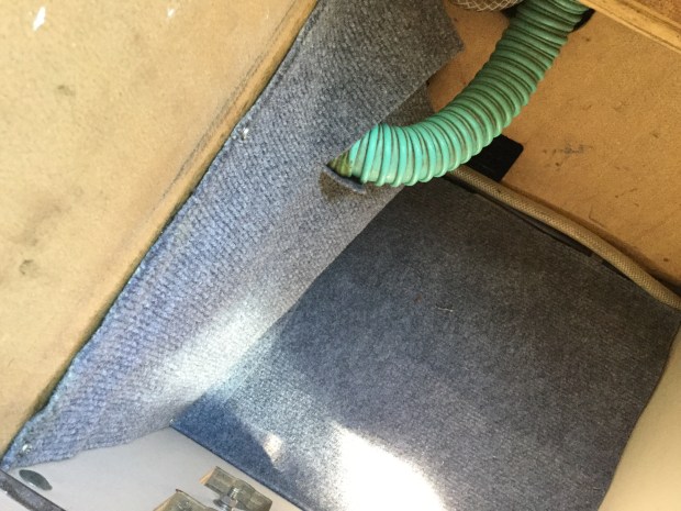 You notice that the little wall that separates the cupboard from the wiring has been removed. I, like many other owners, removed that wall early on to gain a little bit more cupboard room. To protect the wiring from shifting cupboard contents, I screwed on a bit of the cheap carpet I’m using as cupboard bottom liner.