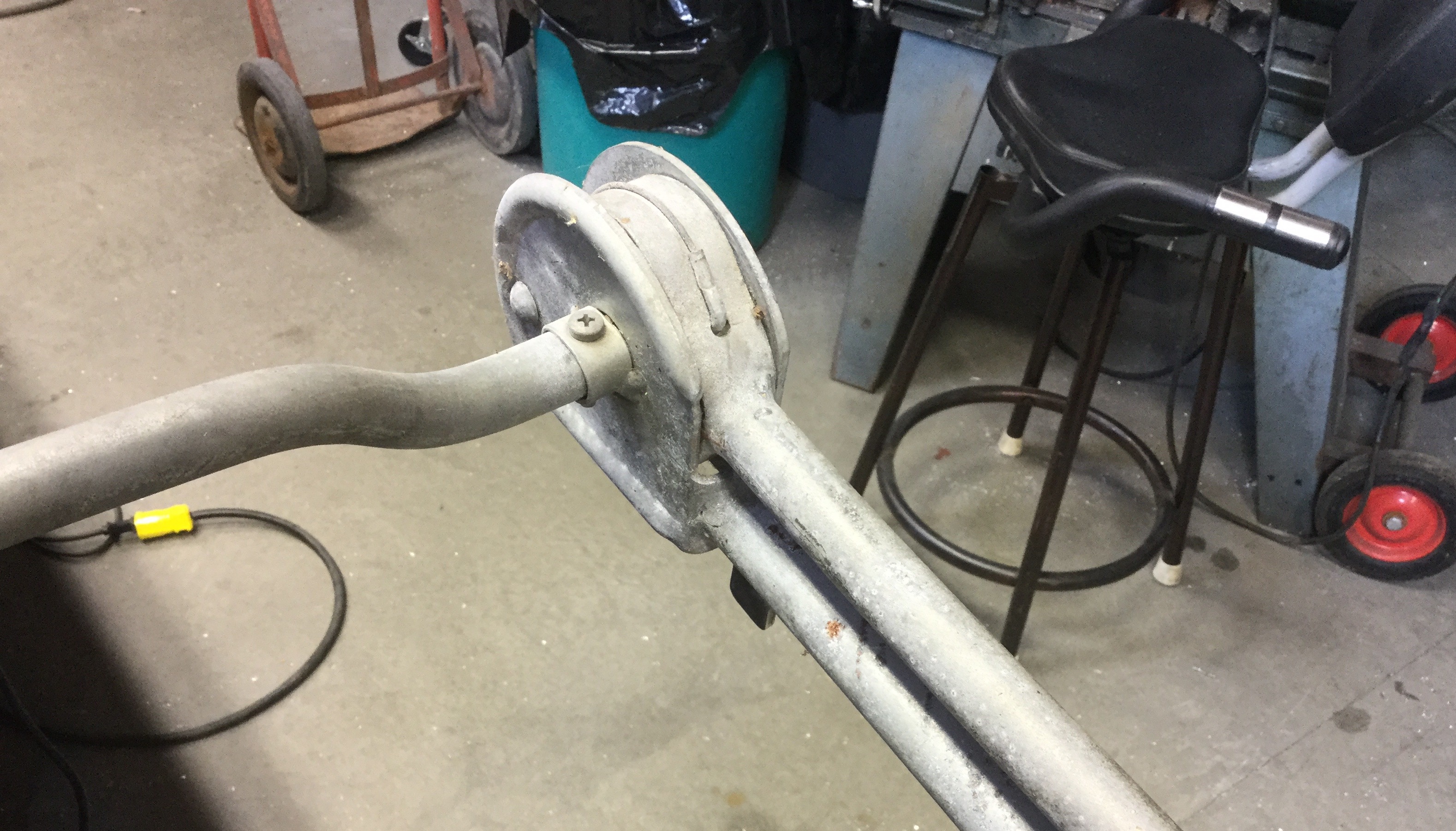 A couple of notes on the hinge. The horizontal bar extends into the hinge through that collar ( with the screw) and near the end it get worn away. There will be a pic of that coming up. The hinge is folded up fully, as it would be when the top is down, and that steel cable you see running up over the round centre section continues down and back into the tube on the bottom where it connects to a spring. Again, more on that later. But as is, the assembly is under tension and wants to straighten out (tubes are tied together out of shot).