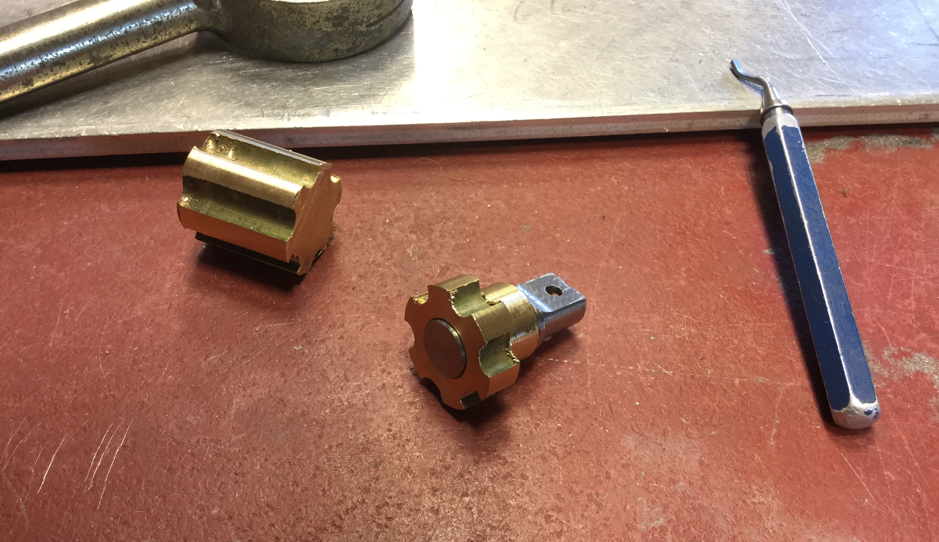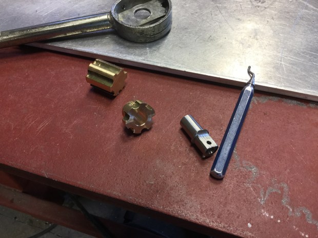 Ok, now the bushings. I had a small bit of bronze (or maybe it’s brass) salvaged marine shafting. I had fooled around making flutes on it with the index head. I was learning, wasn’t a great job, had the head offset so the grooves were asymmetric, blah, blah. But there was enough of the stuff to work with.