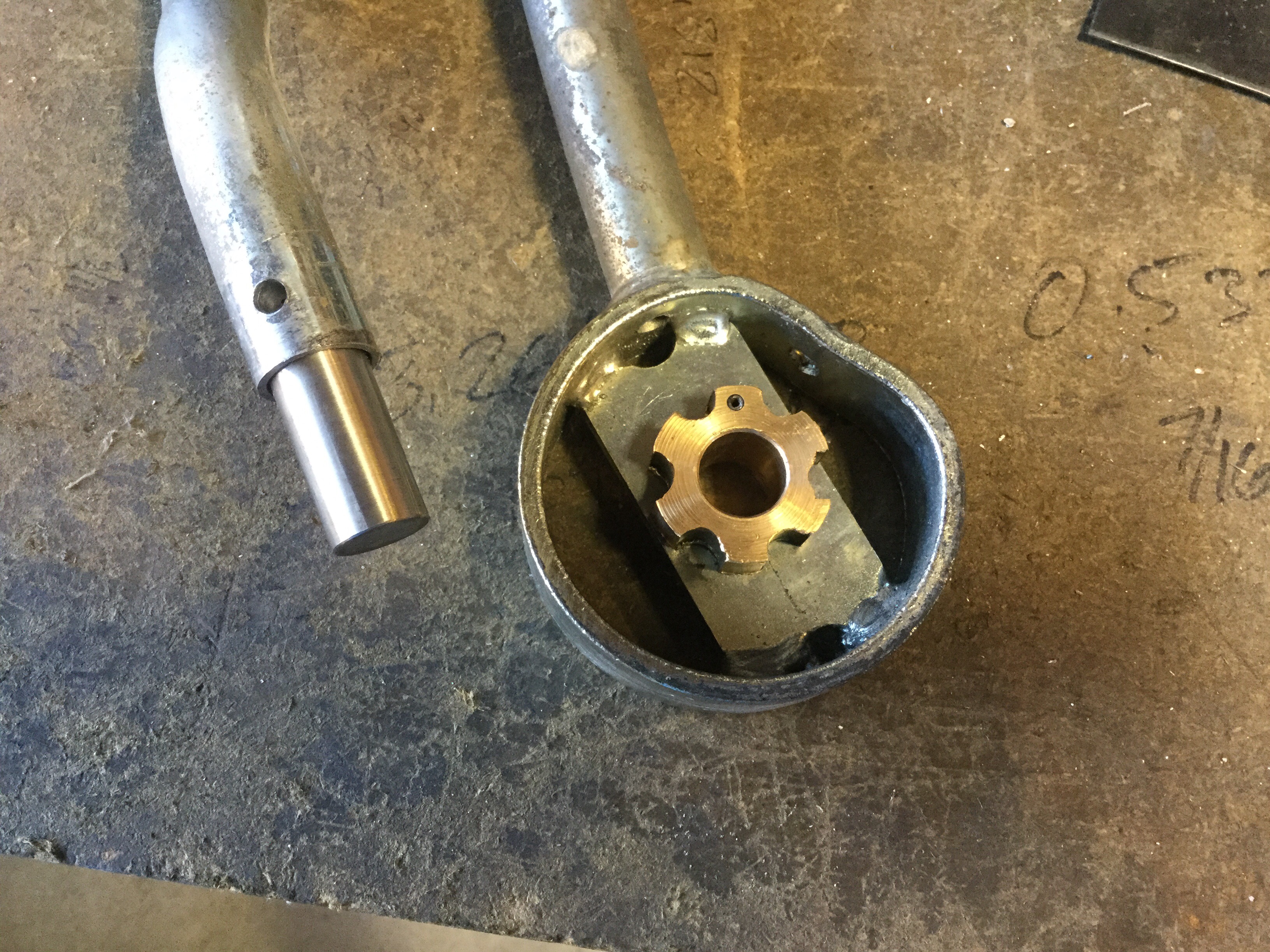 Notice one end of the little shaft has a flat milled on it and a cross hole drilled? That end will fit into the cross bar with the hole lining up with the existing cross bar hole.