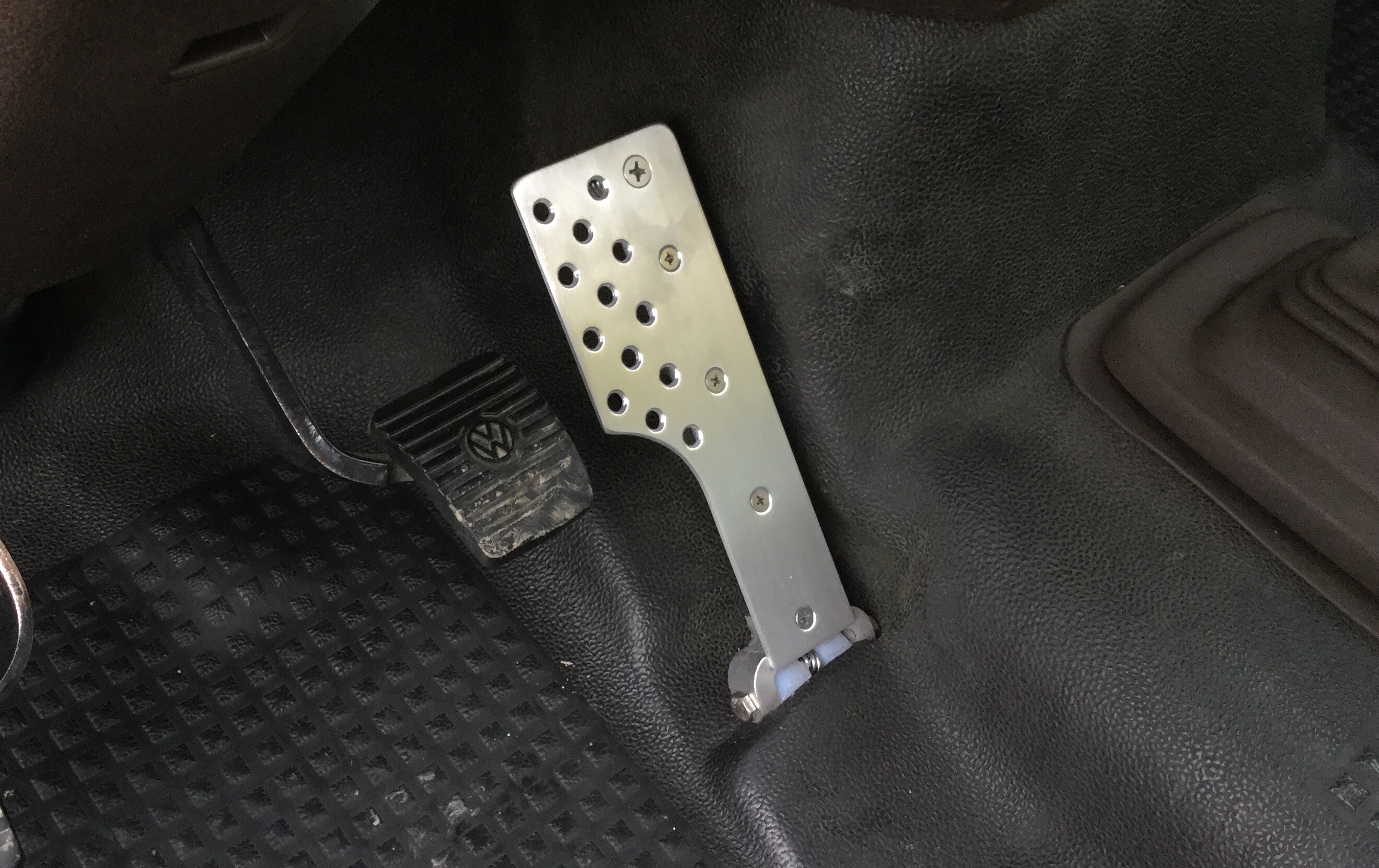 Mat back in, pedal installed. The top surface of the pedal is removable. I’m thinking I might make another that is slighlty wider at the top, the extra width on the brake pedal side. It feels ok underfoot and I can feel the resistance of the extra spring. I’ve yet to road test it.