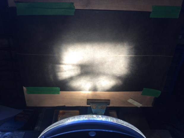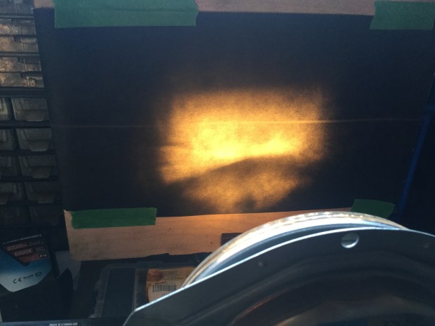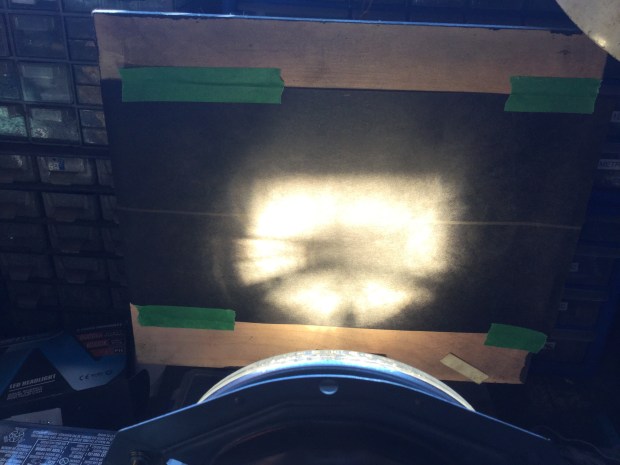 As I had one of the led bulbs in hand I thought I’d try comparing it to a 55/60W halogen in a couple of 6.5″ e code H4 lamps. These are nice German made Hella lamps, new old stock, unused, meant for the Iltis military vehicle. I thought I’d shine the lamps onto a bit of black card and see what the beam pattern looks like at a very short projection distance.