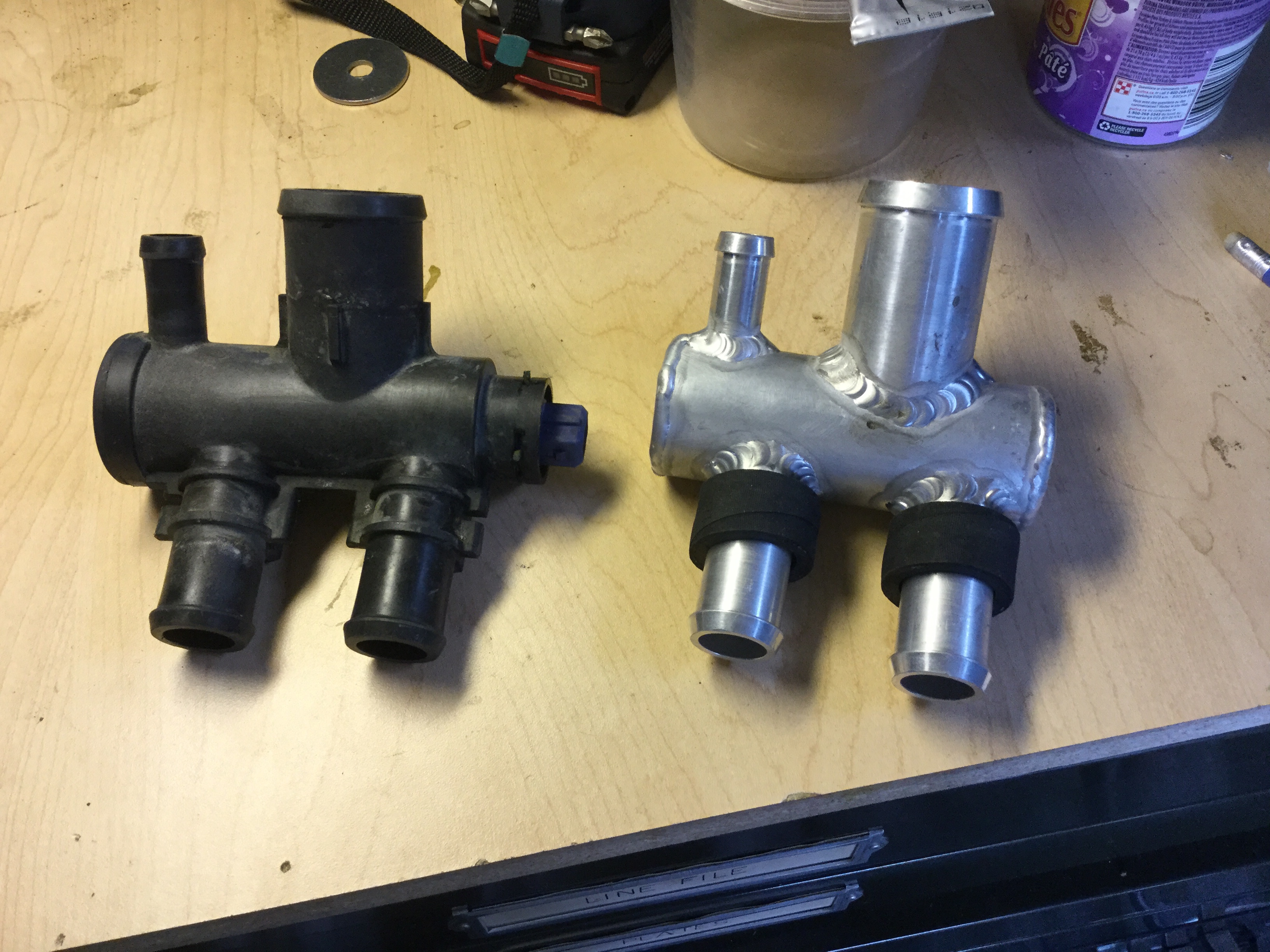 A few months ago I swapped in an aluminum version of the stock plastic coolant distribution manifold. The 2wd and Syncro versions differ in shape but not in function.