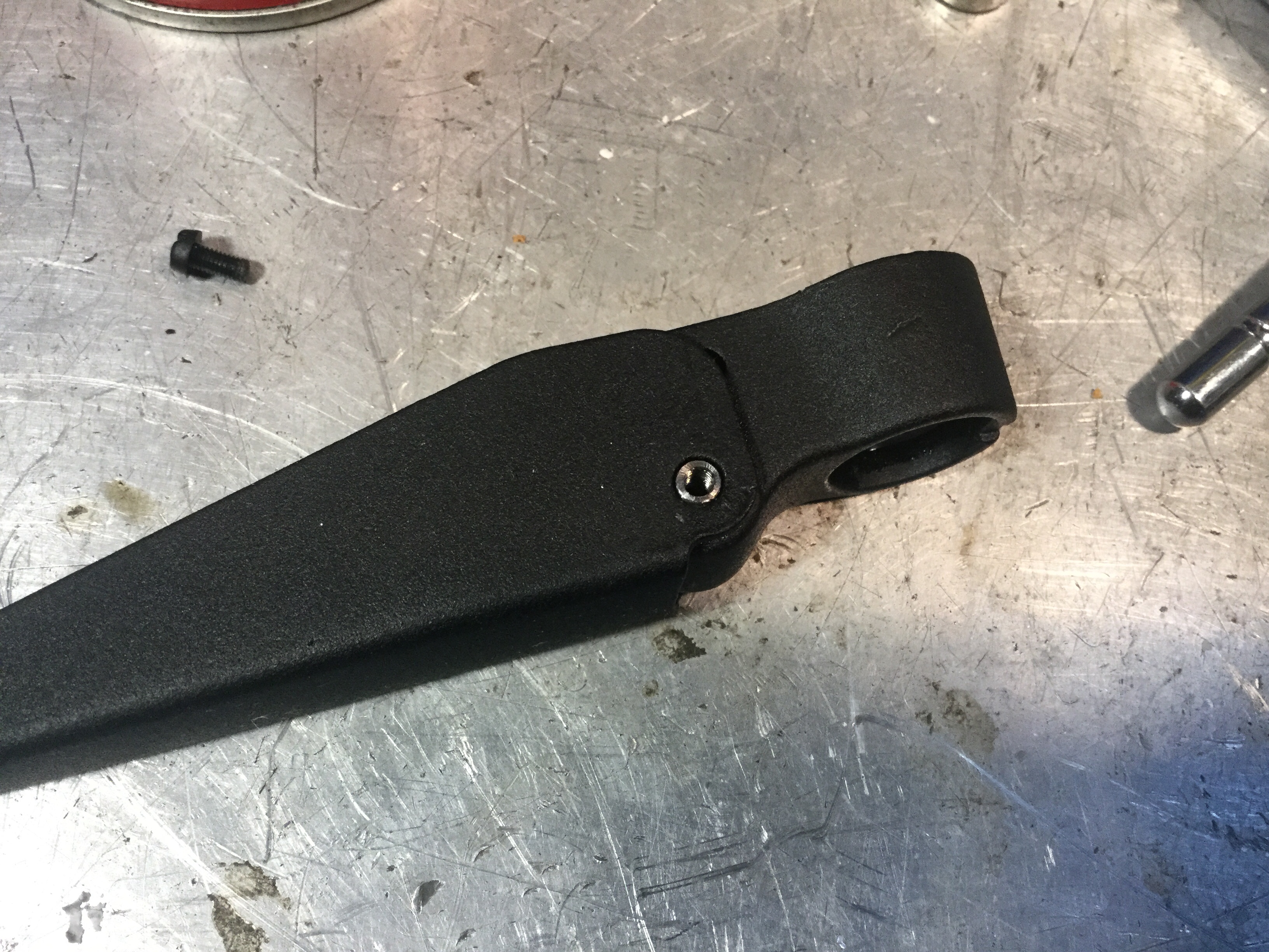 A few posts ago I wrote how I took apart my spare wiper arms for powdercoat. The hinge between the arm and the hub was a steel rivet, had to drill that out. So what to do about reassembly?