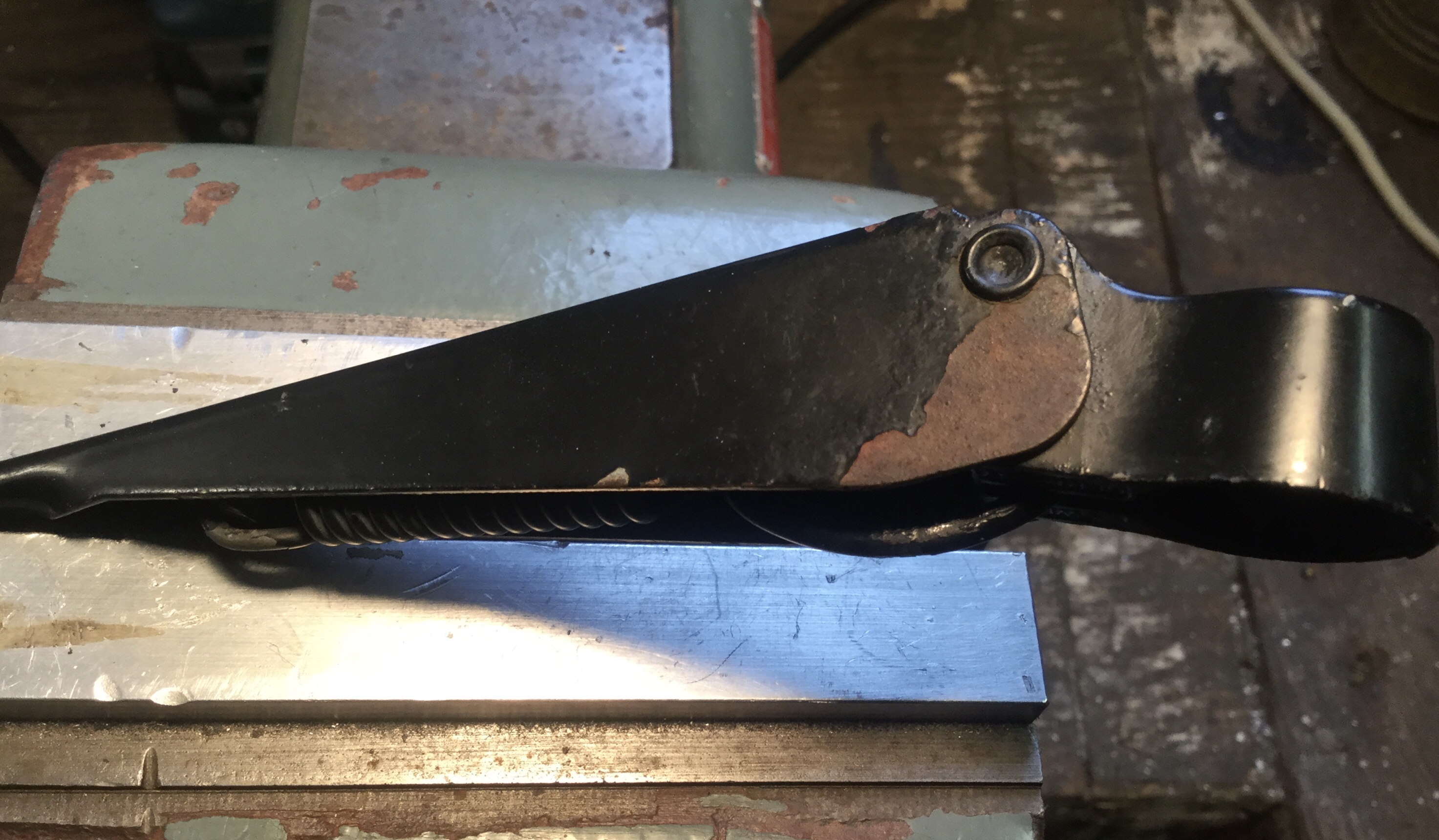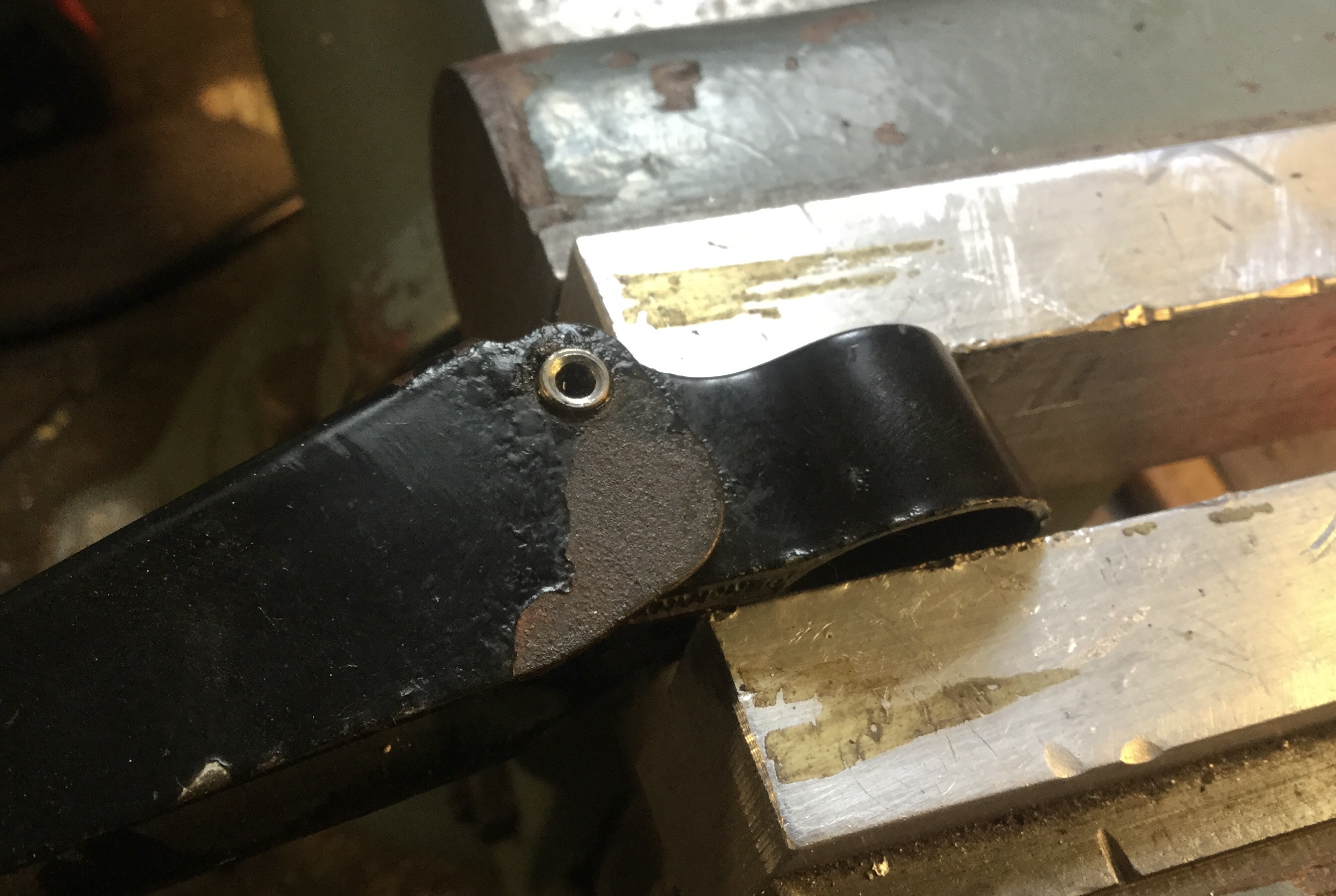 Back to my rivet. Here’s a sequence of pics using another old wiper arm. First couple show how you can hold the “c” connector in a vise and pull back on the arm to release hub. Head of the stock rivet drilled out and punched thru. Stock rivet 50 microns larger diameter than the Chicago screw… yadda yadda yadda…you get the idea.