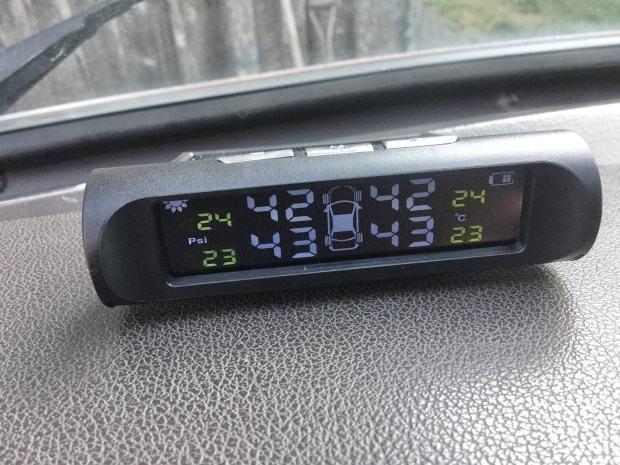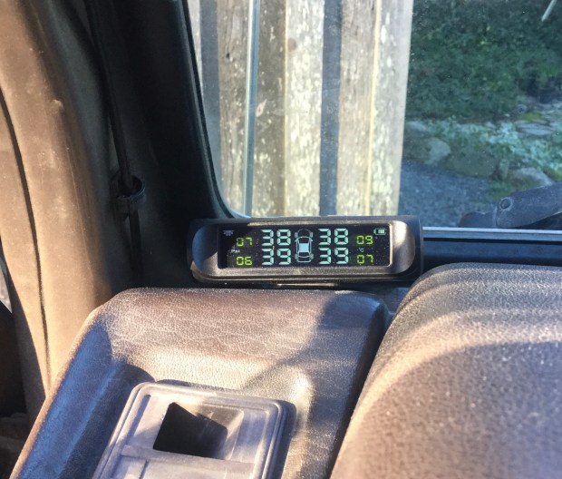 For the first while I was obsessed by watching the pressure and temp during trips. I wanted to see if there were any temperature differences between front and rear wheels during braking on long descents. Maybe I saw a 5-10 degree difference sometimes, but as the senders are sticking out in the airstream I’d say it’s not a good way of monitoring brake temps, but you do find out which side of the parked van the sun is shining on 🙂