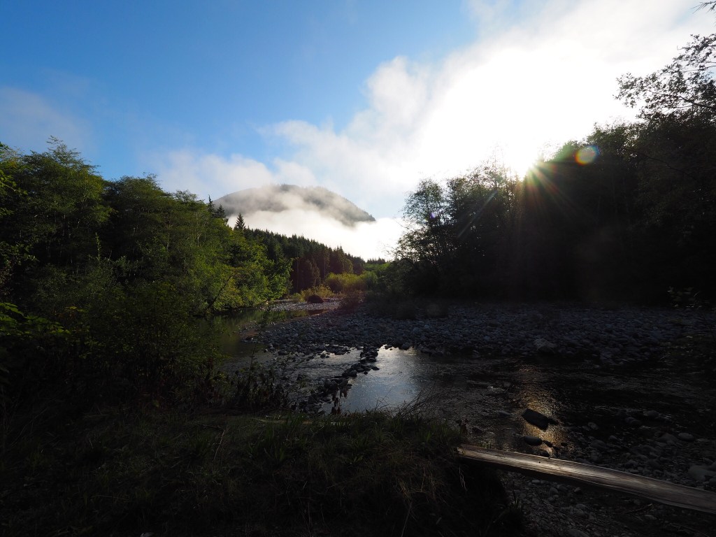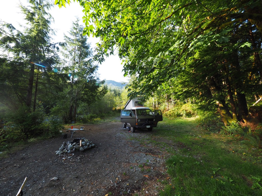 At the lake we headed west on the south shore road , and back onto rough gravel. Onward west, and into the Nitinat watershed. Nipped down the wee road to check out Nitinat river falls camping area. We’ve camped there a couple times before, but there were others there this time and so we headed back on main road, onward to the bridge across the Nitinat , and looked for spur road that we had gone up 10 years ago…