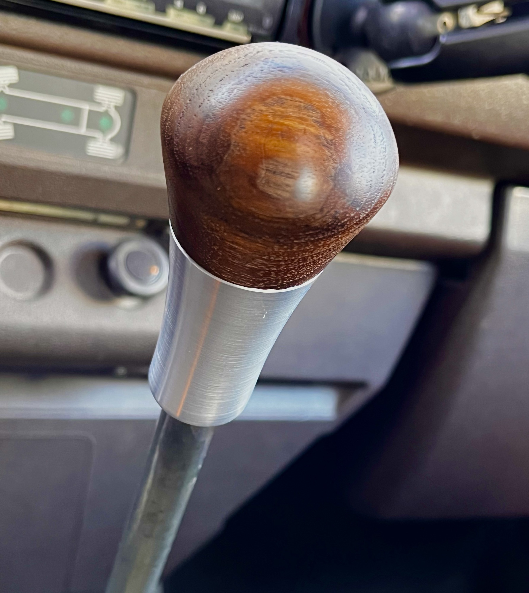 It got too cold for the aluminum shift knob I made a while back. I mean it, it’s not the greatest choice of material for a shift knob. So yesterday afternoon at end of work I quickly made one with a bit of wood. Scrap teak that I had at work for some reason. Could have been bigger in diameter but that’s what I had. Wood screwed onto a threaded boss in the aluminum base.